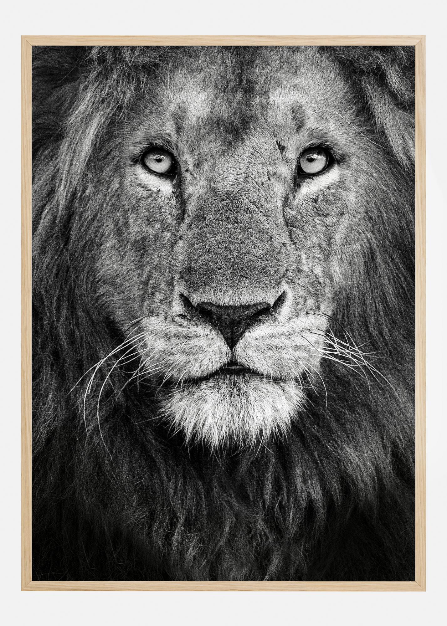 This powerful and expressive poster presents a close-up portrait of a male lion in black and white, capturing the animal's majestic presence and wild essence. The lion's intense gaze, its thick mane, and every individual whisker come to life thanks to the high contrast and detail in the photograph. This is a motif that immediately draws the eye and creates a deep and lasting impression.