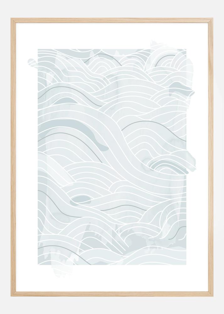 An ocean poster with soft blue abstract lines and waves on a white background. Different tones of blue and various line thicknesses combine to make these undulating waves across the page. Let your mind wander and get swept away with this soft ocean design.
