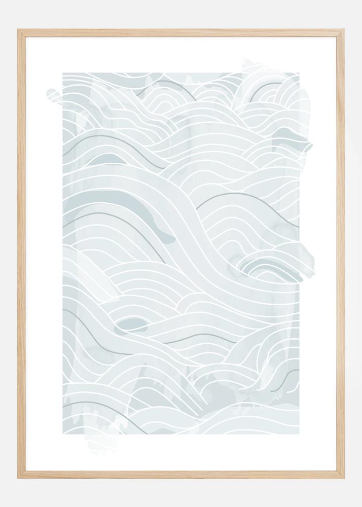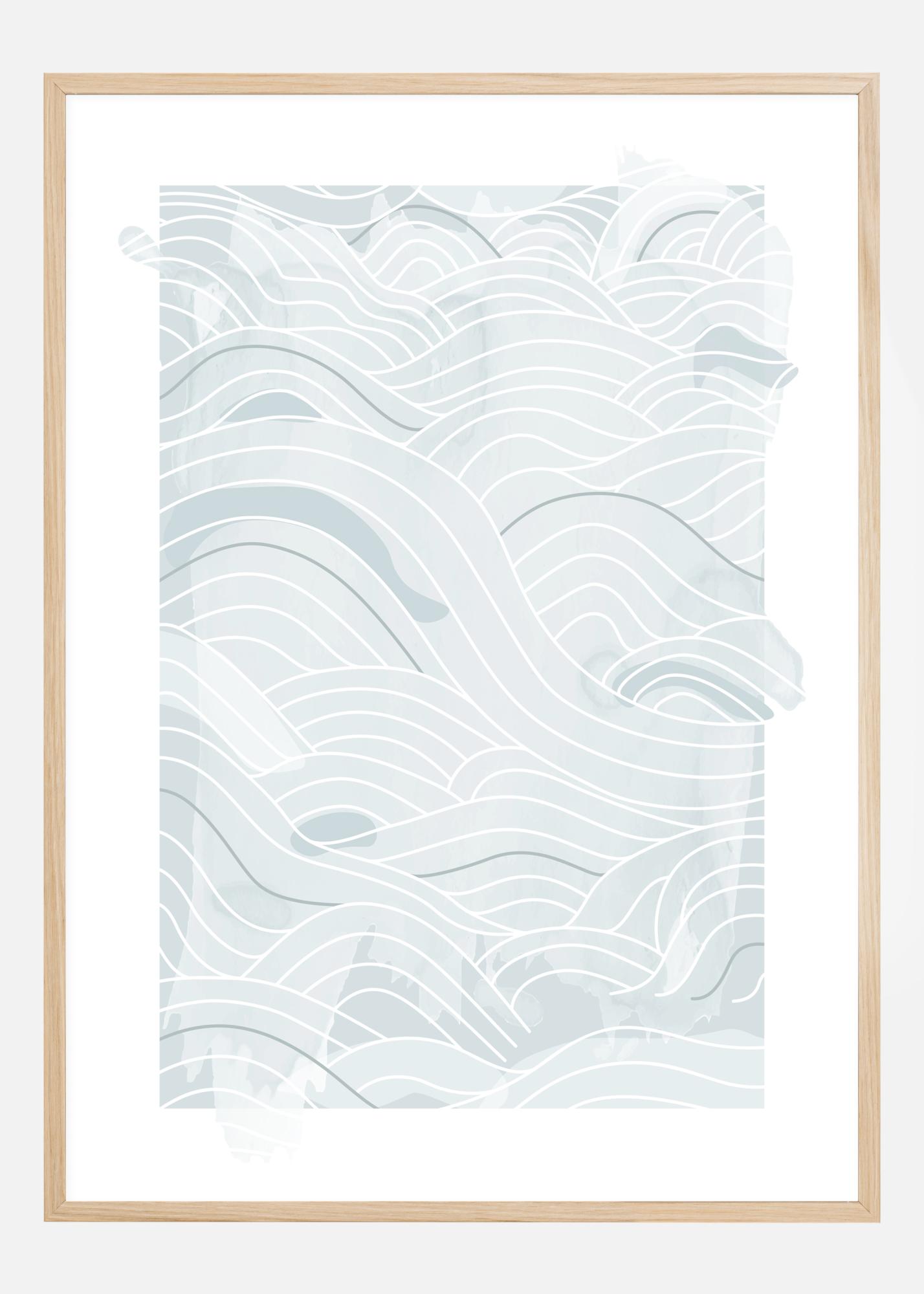 An ocean poster with soft blue abstract lines and waves on a white background. Different tones of blue and various line thicknesses combine to make these undulating waves across the page. Let your mind wander and get swept away with this soft ocean design.