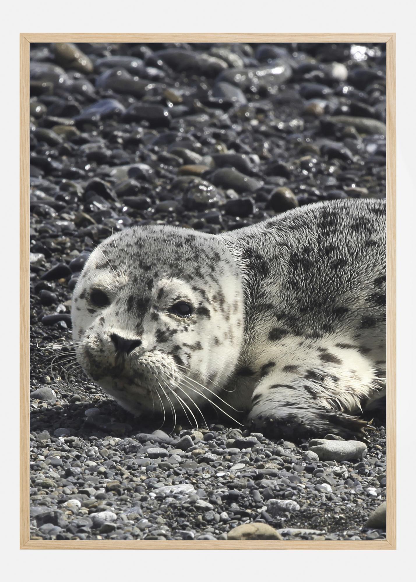 A beautiful wildlife poster of a seal on a rocky shore. The common grey seal sits on the rocks, almost camouflaged. The spots on its coat mirror the pebbles behind. Stare into the soulful eyes of this marine mammal when you bring this image home.