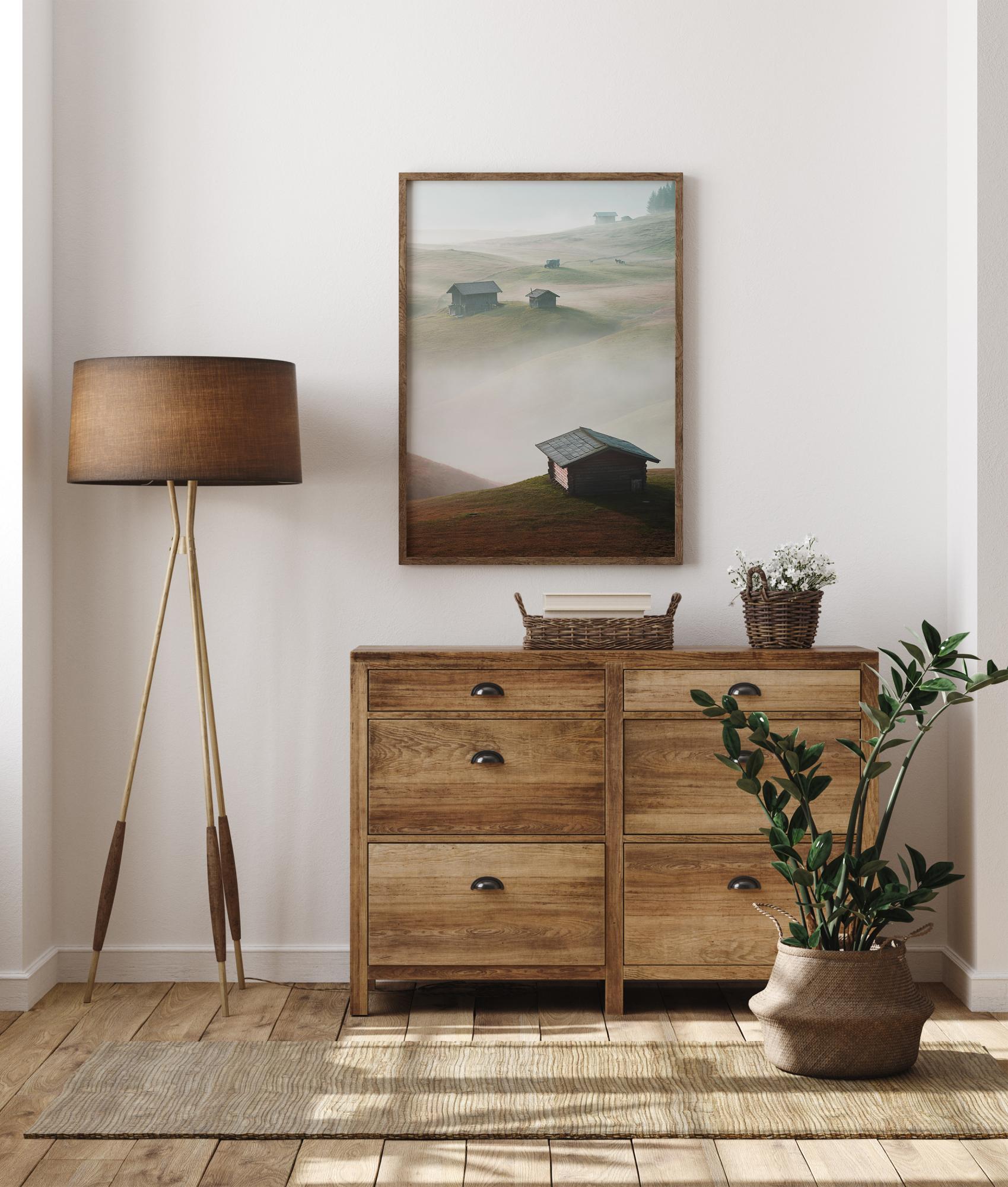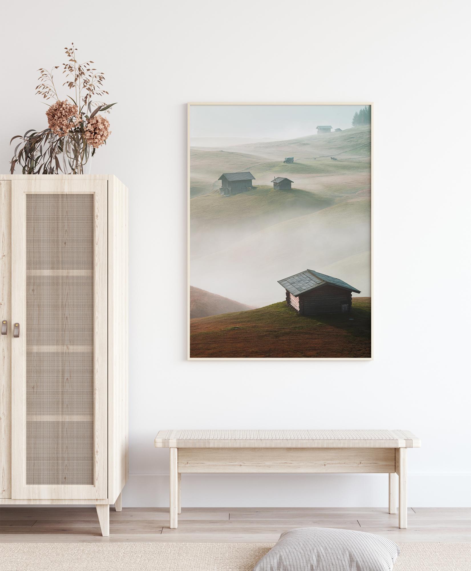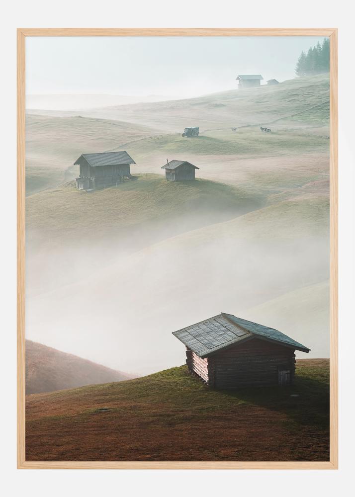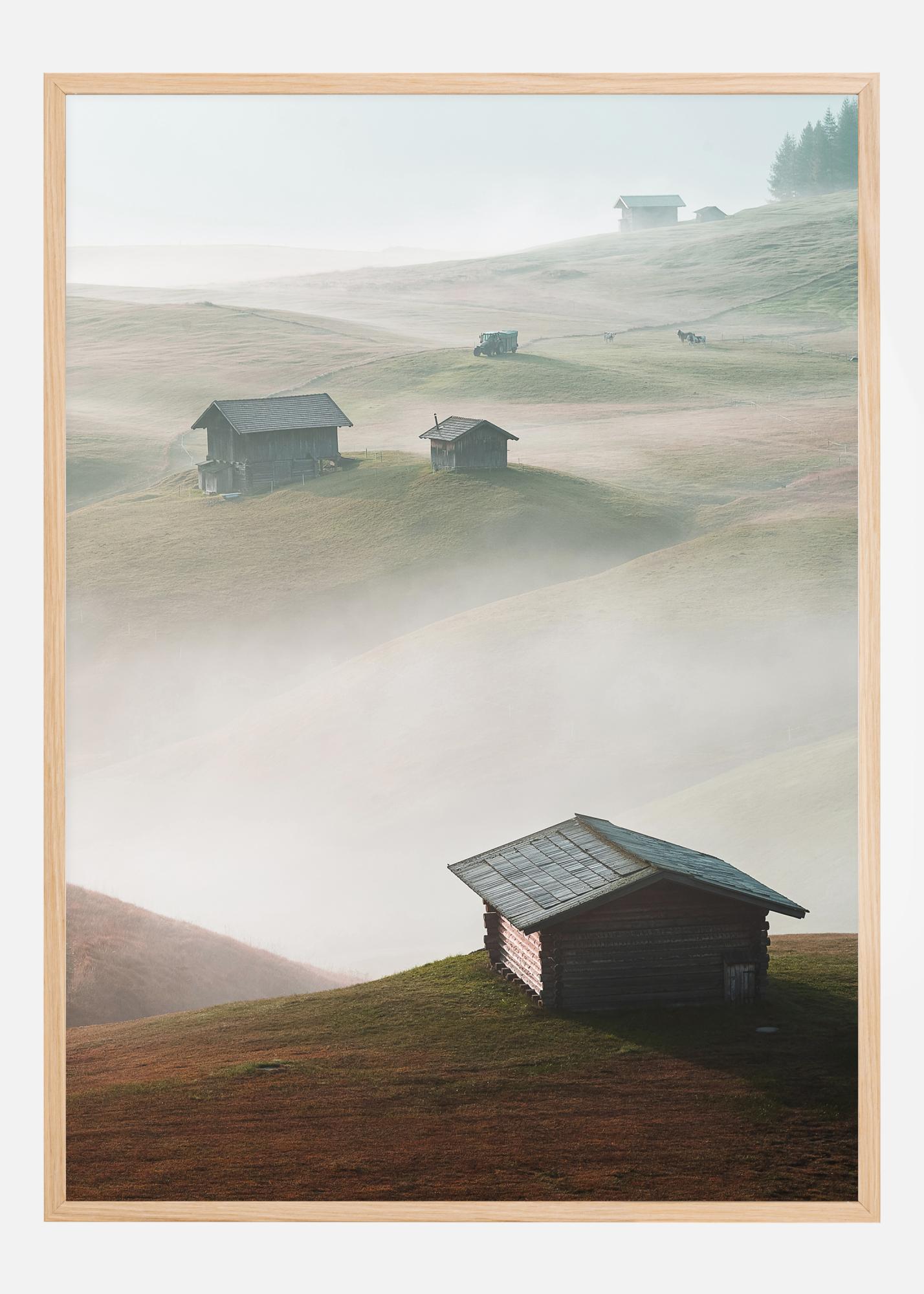 A magical poster of houses sitting on hillocks raised above the mist and clouds below. Each little hut stands out on the rolling green hills. Mist between each make the houses look as though islands separate them from each other. Lose yourself in this wide vista.