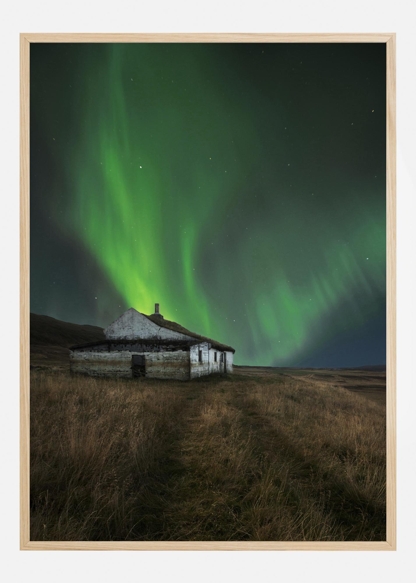 A stunning poster of a bright green and yellow aurora above a small white house. The bright colours of the Northern Lights seem to move and flicker as you stare at this mesmerising scene. Take in the grandeur of nature and bring this natural phenomenon into your house for ethereal beauty.