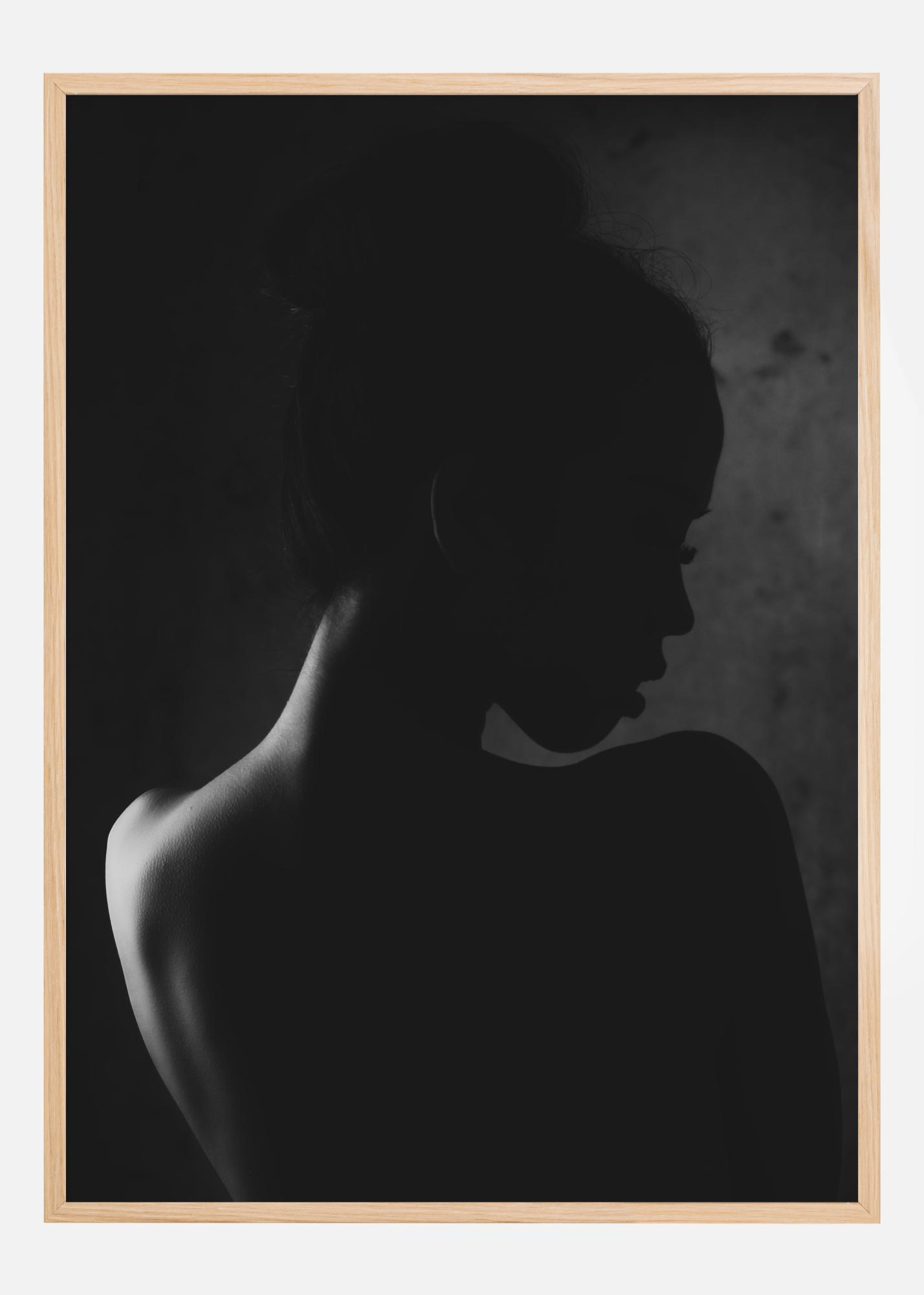 A mysterious portrait poster of a young woman with her back turned. Lit from the left, her shoulder is highlighted in a glow of white, the rest of her is in shadow. Lips parted, she half turns her head to look back at you over her shoulder in this sensual image.