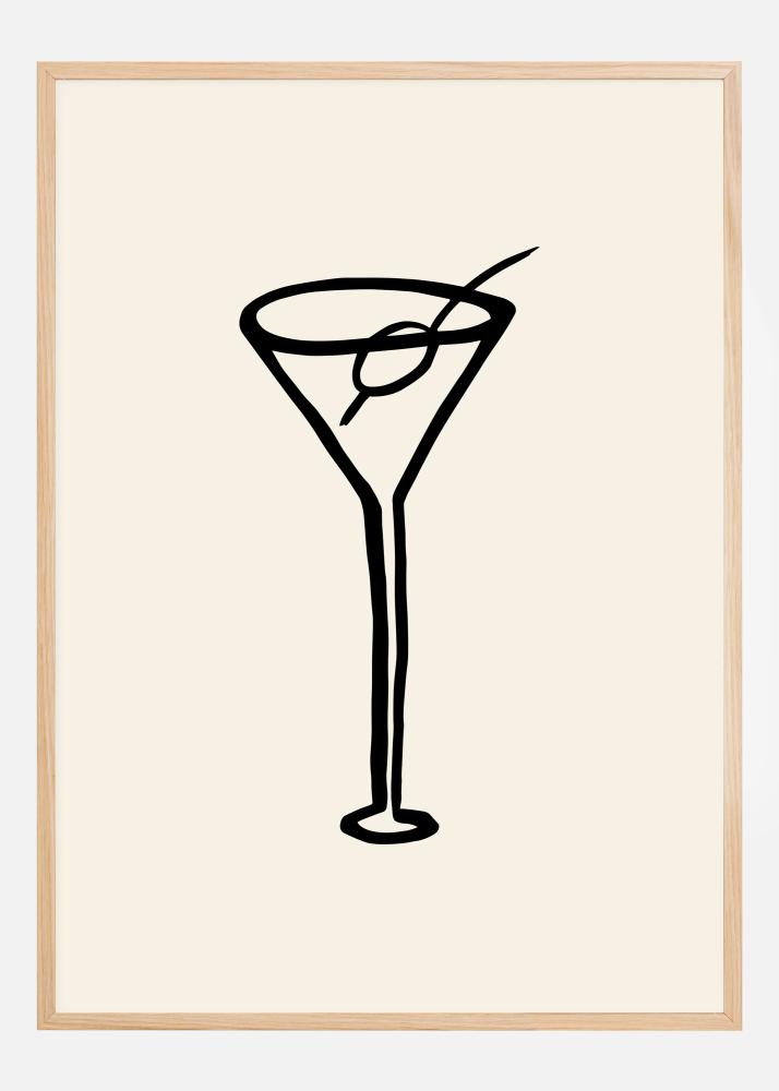 A simple poster of a cocktail glass with an olive in it. Get that James Bond vibe when you hang this simple black line drawing of a martini glass on your wall. Pair with a bold wall colour for this strong drawing to pop. Are you shaken not stirred?