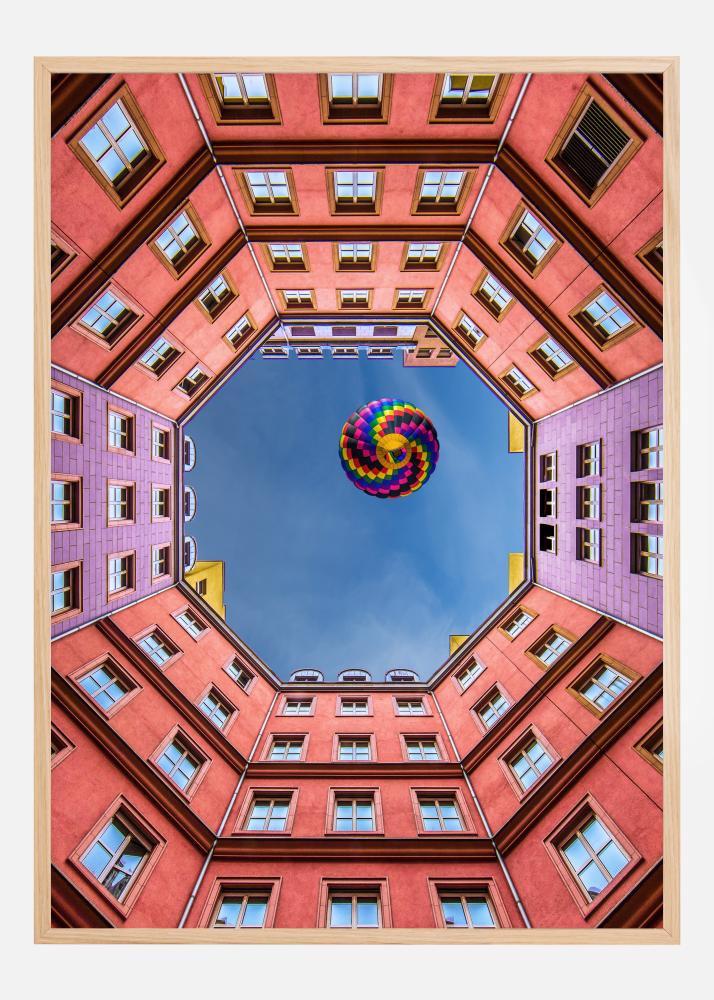 A vibrant poster looking up through pink buildings to the bright blue sky. The buildings make a hexagon as you look up past all the windows. In the middle of the blue sky is a rainbow hot air balloon drifting across the opening. Float away on your imagination in this bright, upbeat image.