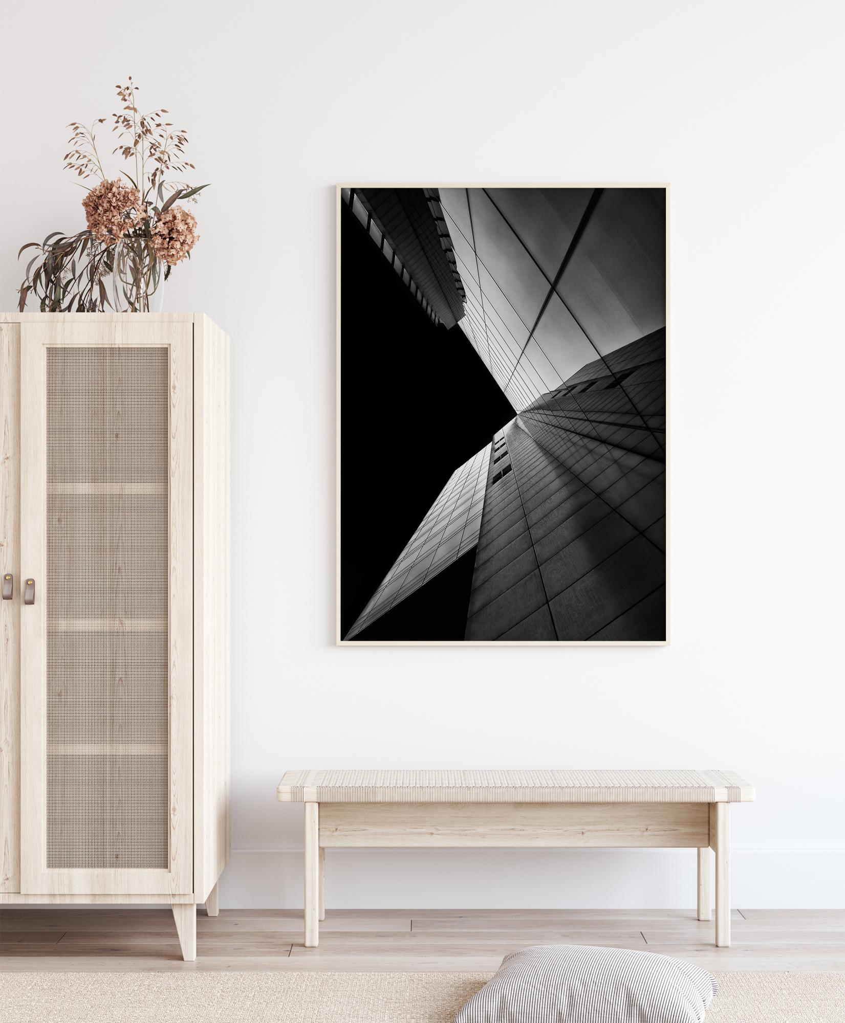 An architectural black and white poster of the side of a building at night. The geometric lines of the windows lead the eye to the centre of the photo. Bright white buildings reflect in the glass, the night sky providing strong contrast to the side of the building. Pair with a coloured wall to push that contrast to the max.
