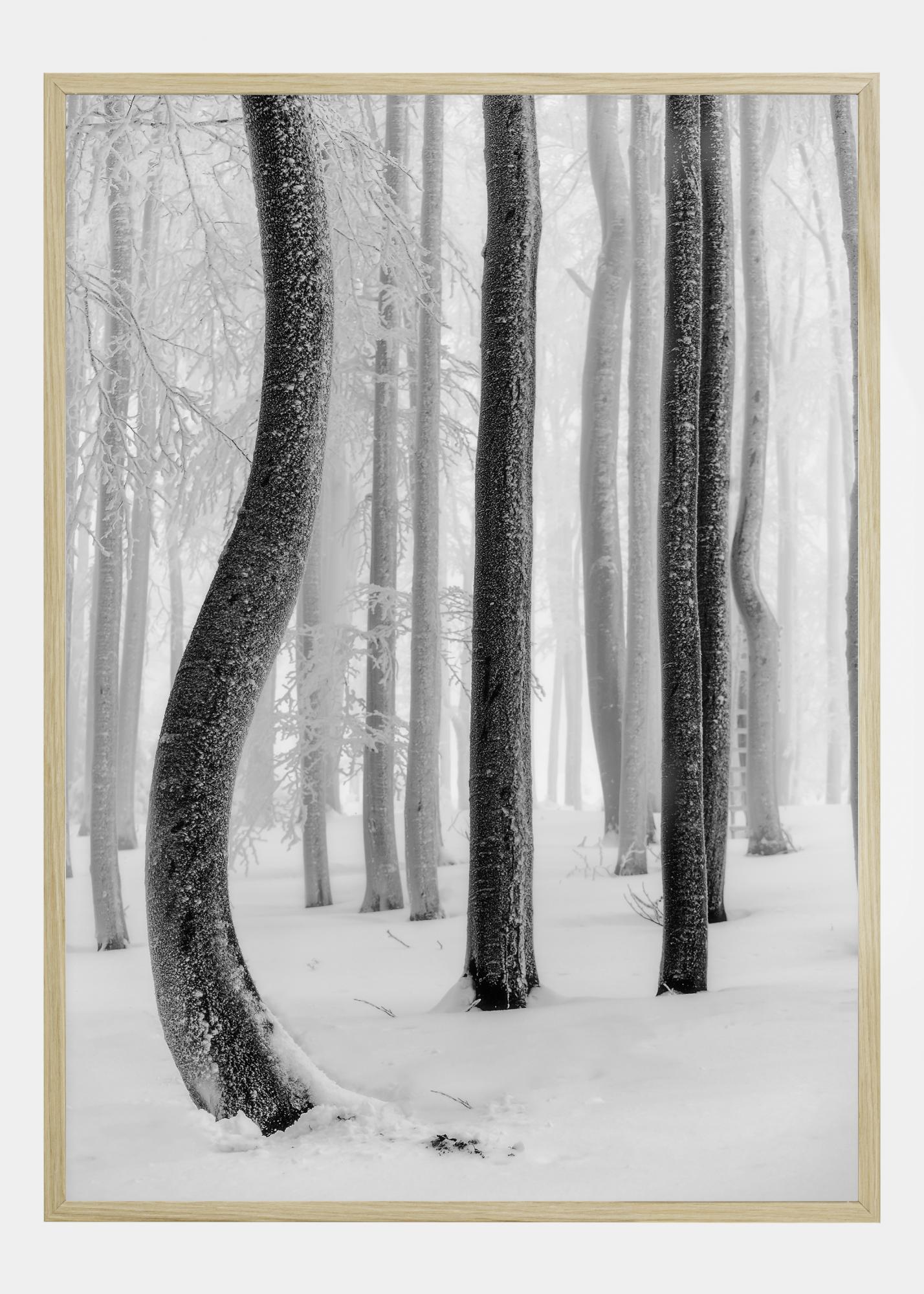 A stunning nature poster featuring geometrically growing trees. This magical image shows dark trees in a snow-covered woodland. Bring this poster home and bring winter into your house in a stunning way