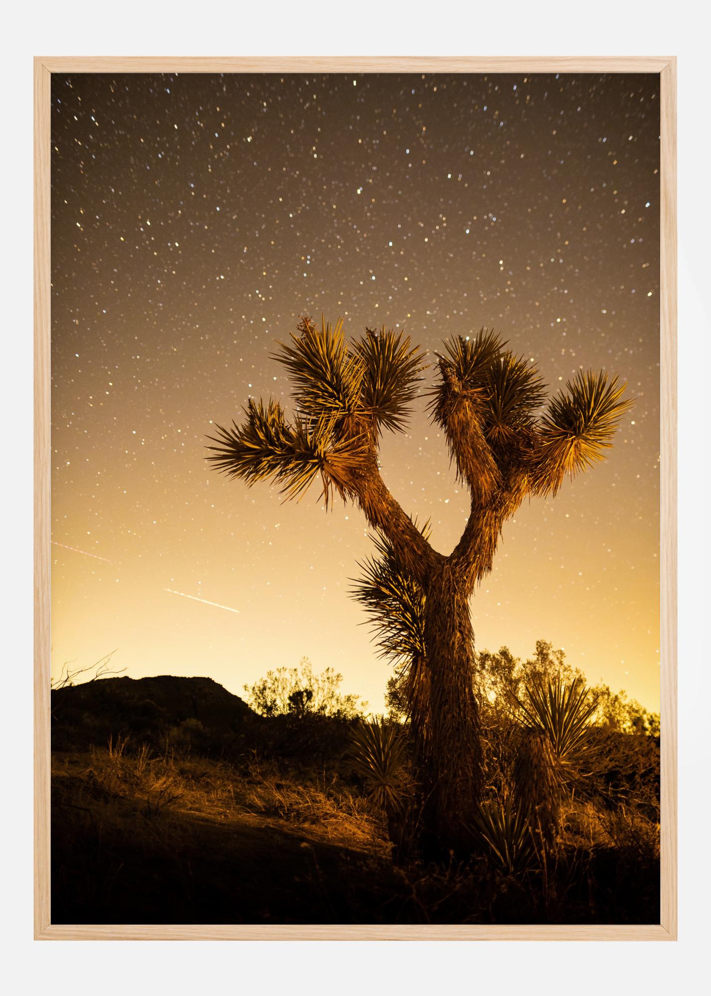 A night-time poster of a large cactus in the desert standing tall against the night sky full of stars. The cactus is bathed in a soft golden glow as the sun sets on the horizon. Stars wink gently overhead in a soft warm sky. Enjoy the warmth of this desert night sky.