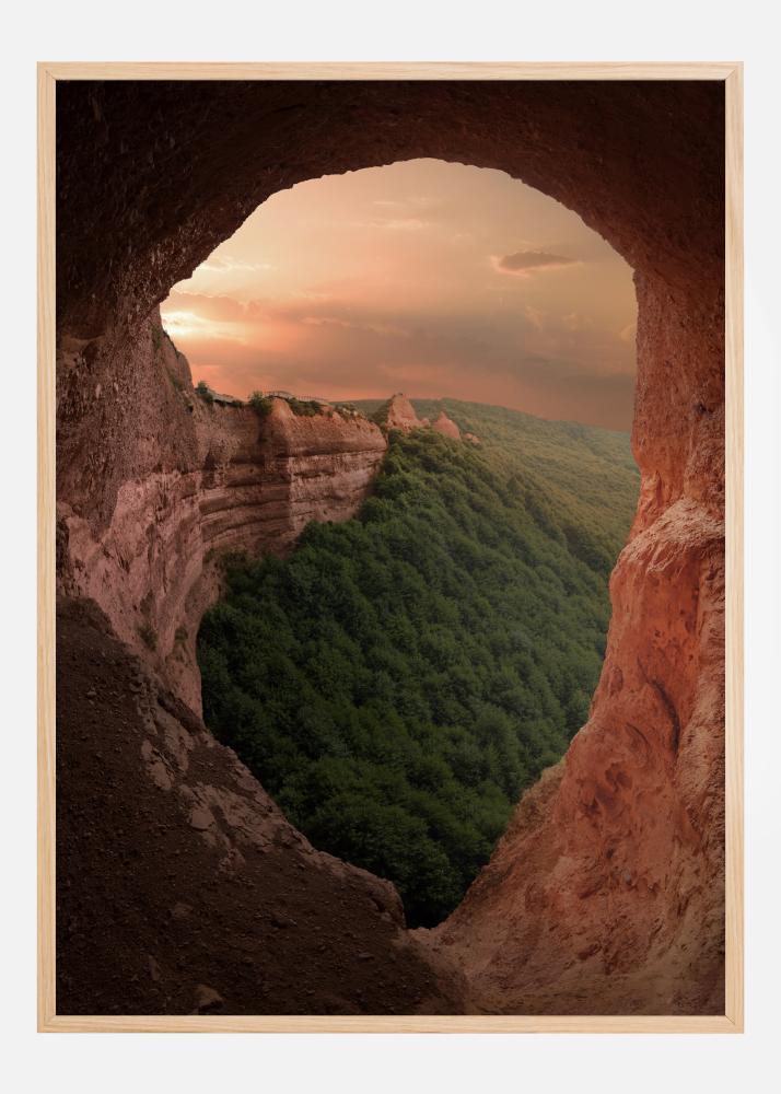 An awe-inspiring poster of a dramatic red landscape. Peep through the opening in the cliff to see the red rocks stretching away in the distance. The growing green trees make the perfect contrast as the sun sets casting a warm glow over everything. Visit this view from the comfort of home.