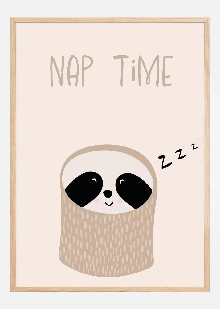 This adorable poster, adorned with the words "NAP TIME" and an illustration of a sleeping sloth, is the perfect wall decor to create a calm and relaxed atmosphere. The illustration is executed in soft, muted colors, with a pastel pink background and the sloth's fur in natural shades of beige and brown. The large, gentle eyes and the peaceful smile on the sloth's face are irresistible and convey a sense of warmth and calm.