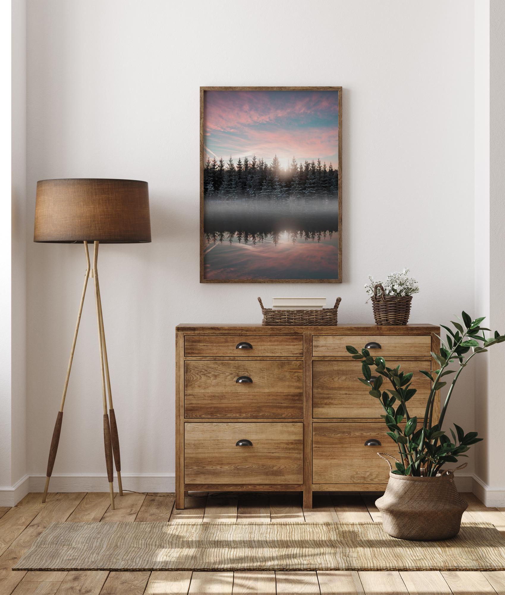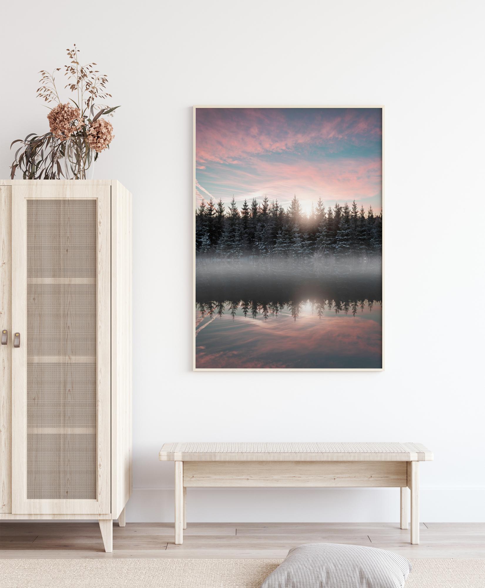 A magical poster of a misty lake in the early morning light. Snow-covered trees stand on the banks, partly covered in mist. The reflections of the trees can be found in the soft pastel colours of the lake. Above the treetops, the sun rises casting a soft glow on the pink and blue sky for a serene ambience.