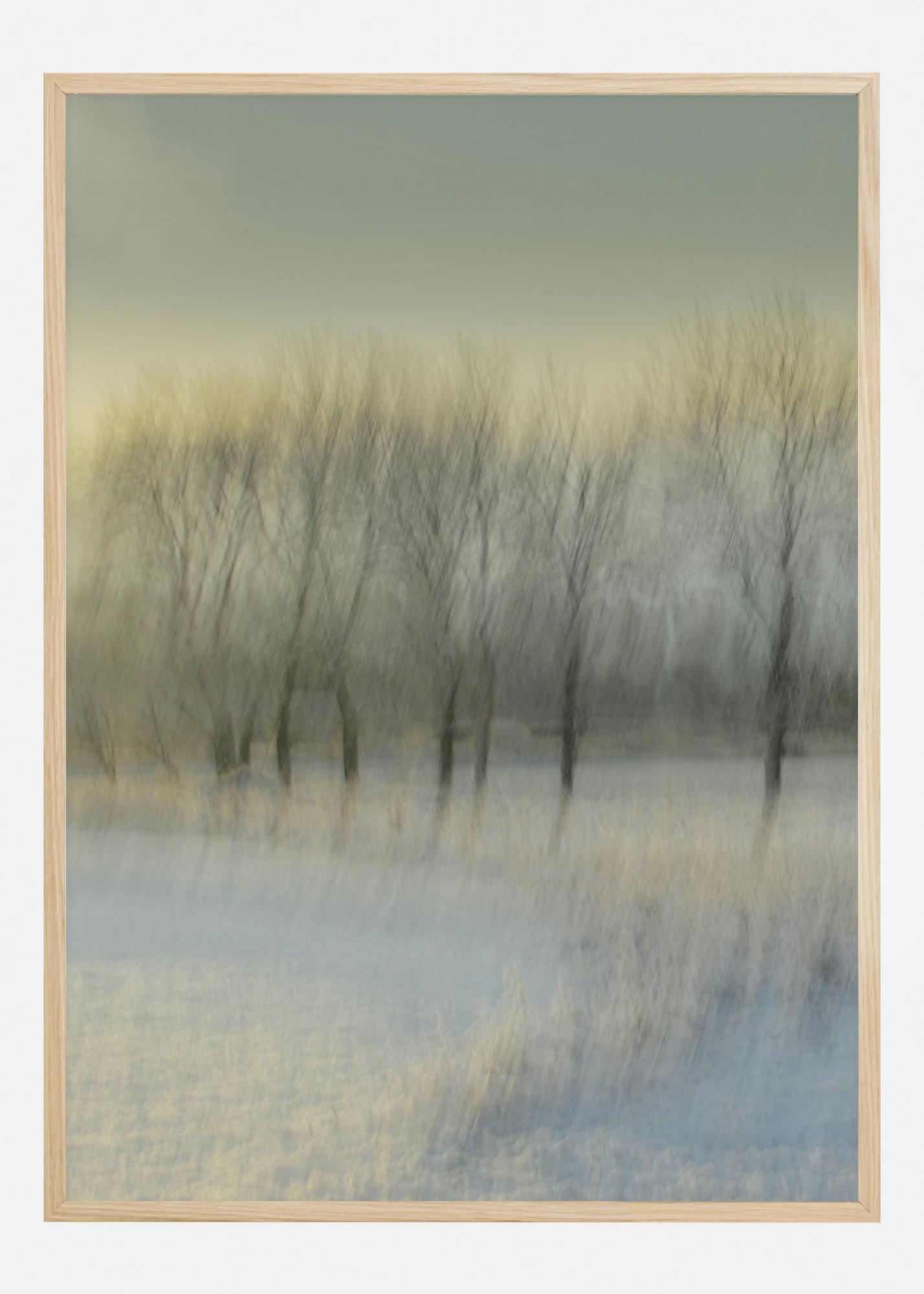A stunning motion blur style poster of trees on a winter background. White snow covers everything in this soft, out of focus image. The trees are blurred, just tall black trunks can be seen and a band of soft yellow floats across the treetops. Magic is in the air.