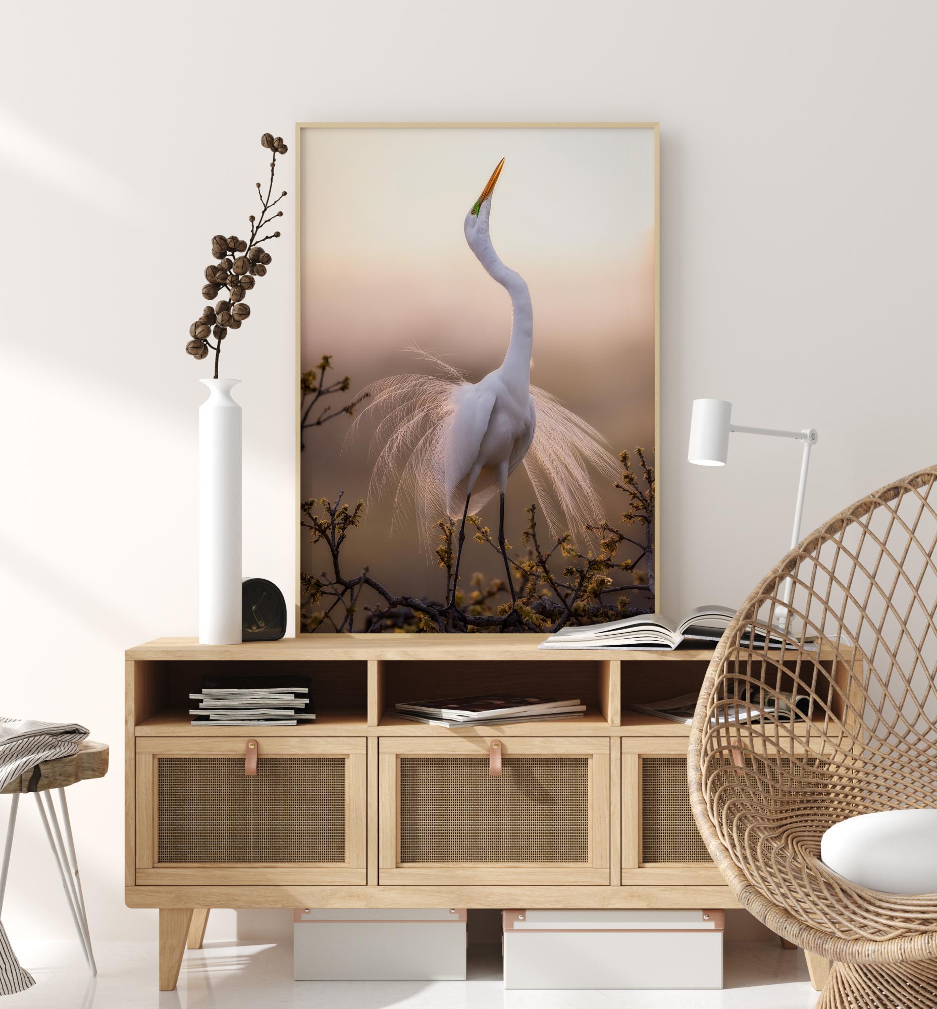 A wildlife poster of a stork dancing in the morning light. Standing tall and white, the soft sunrise through the feathers create a surreal scene. Wake every morning to a sense of wonder with this print.