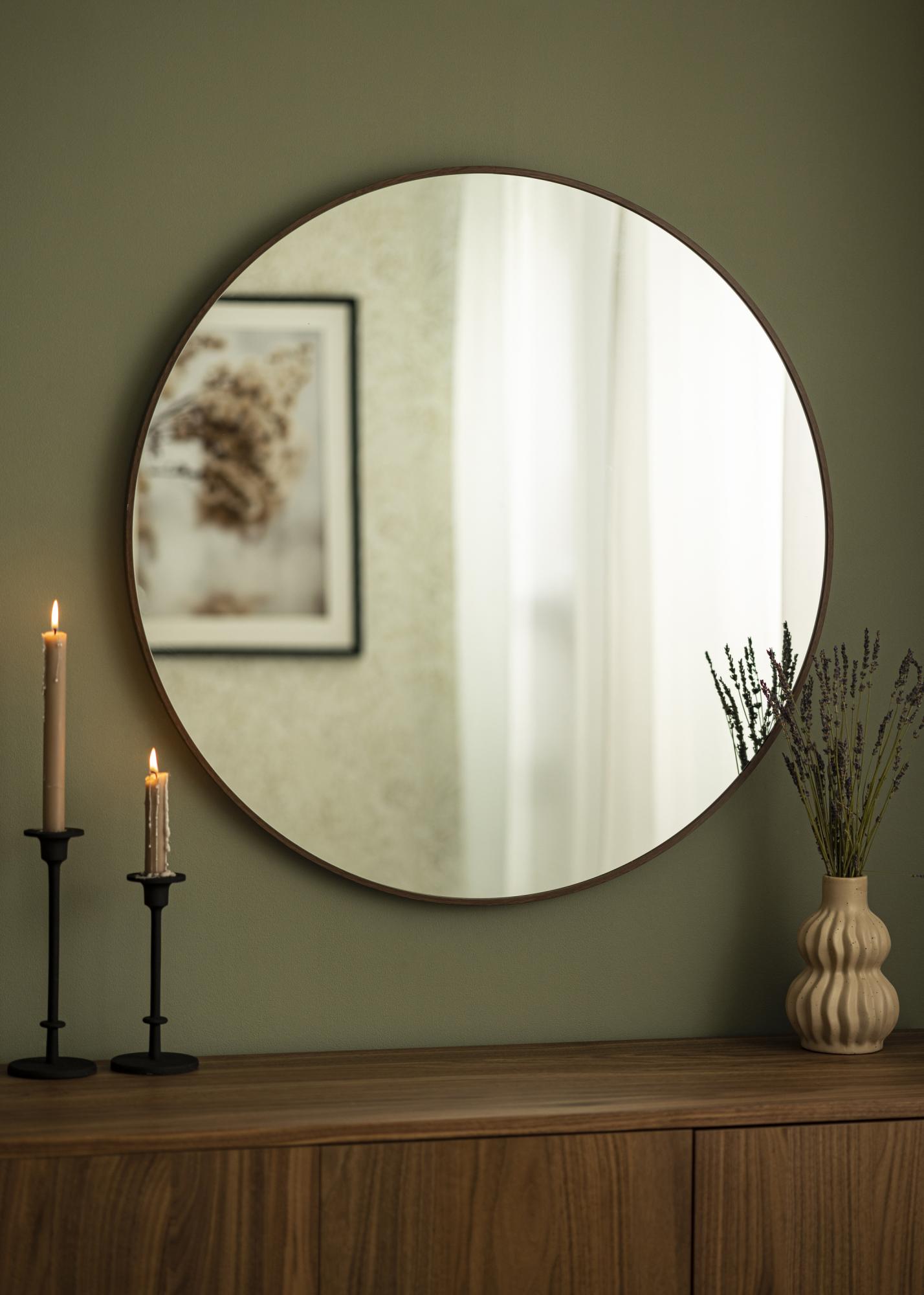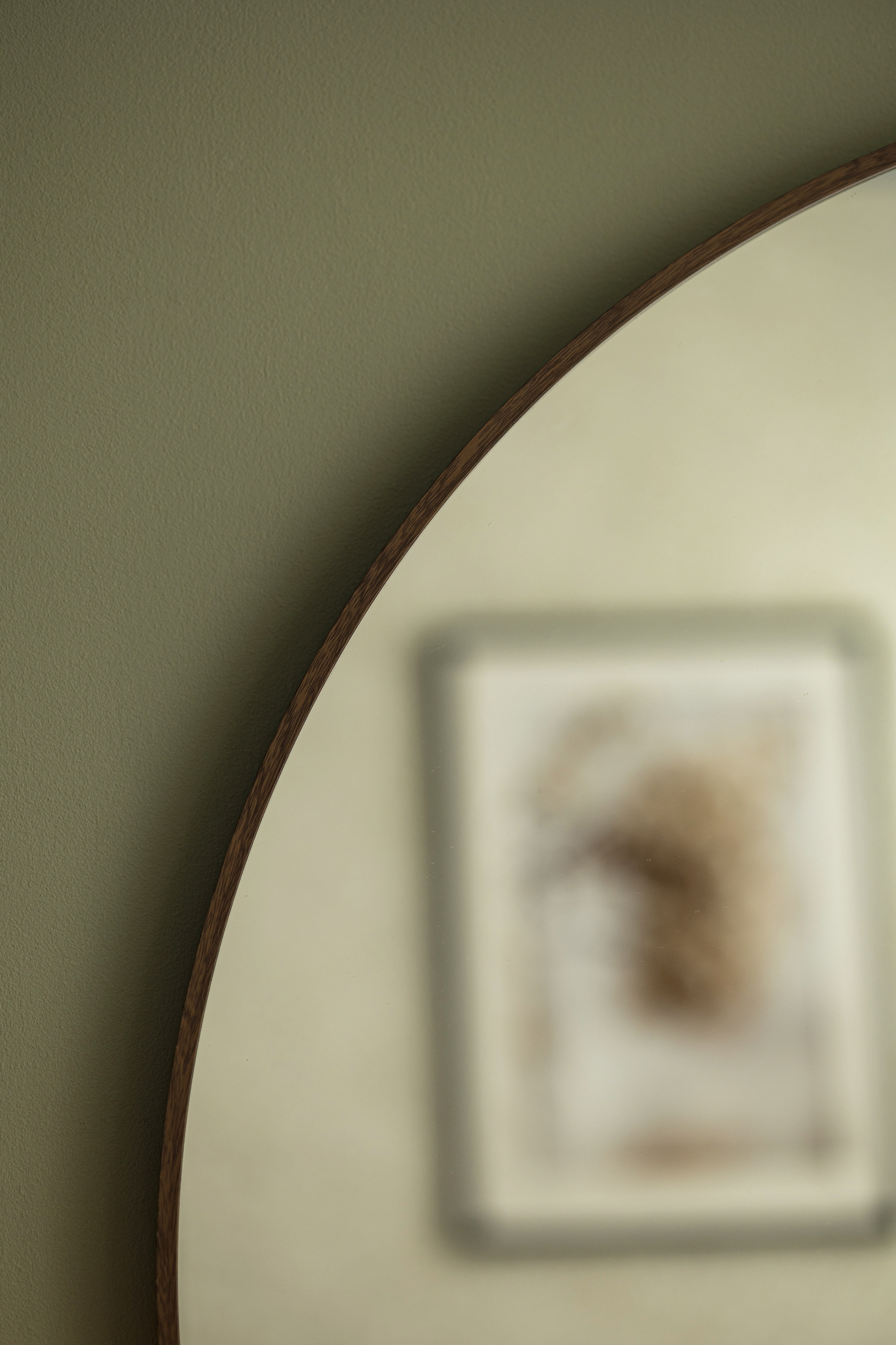 Discover the sleek elegance of our wall-mounted mirror, perfect for adding a sense of space and light to your home. With an impressive diameter of 80 cm, this mirror becomes an instant focal point in any room. Its round shape provides a soft and inviting feel, while the walnut-colored aluminum frame adds a touch of sophistication.