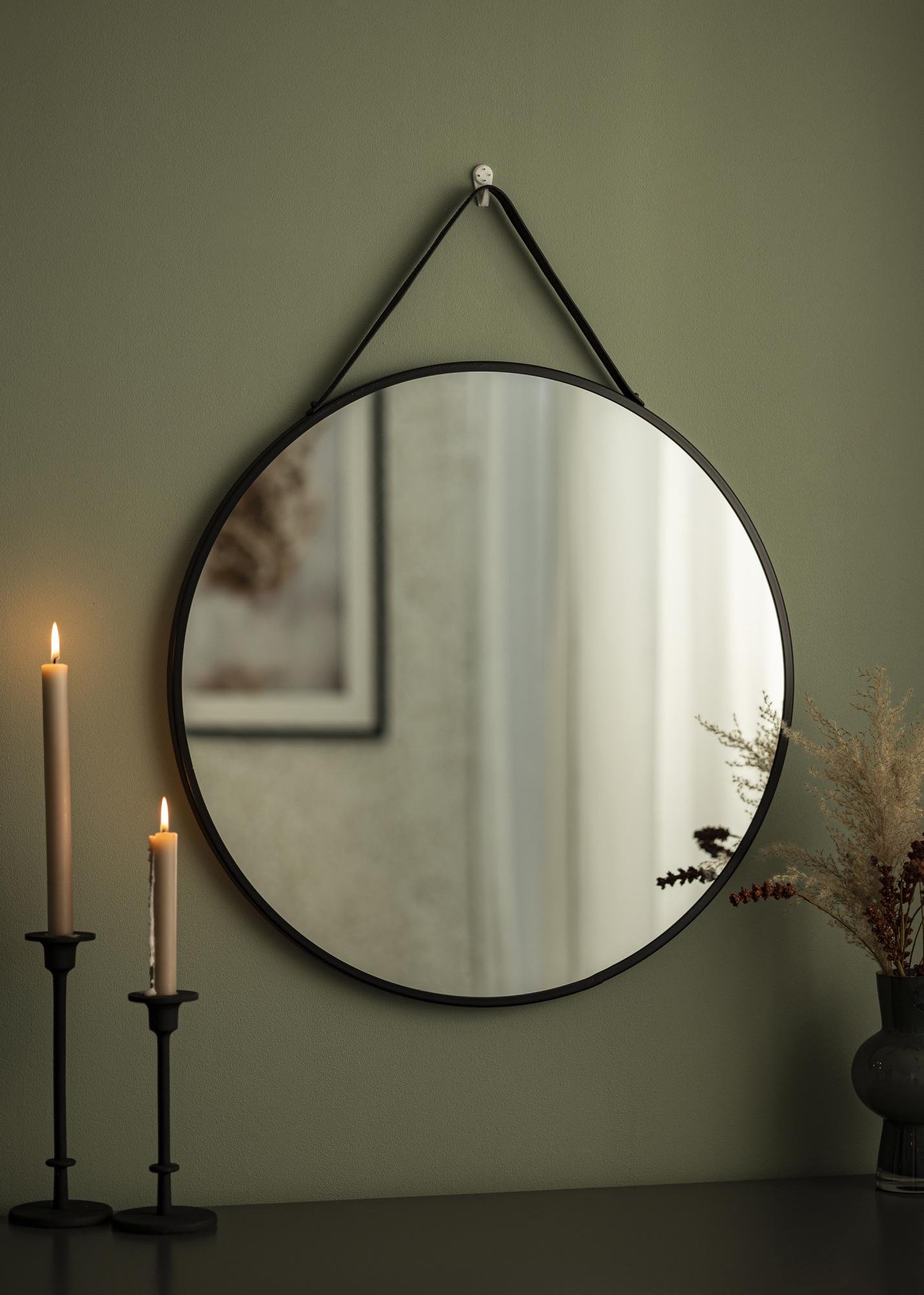 Trapani is a tasteful wall mirror with that little extra. The mirror is round and enclosed by a sleek frame in black metal. The mirror is mounted on the wall with a very decorative strap in faux leather.