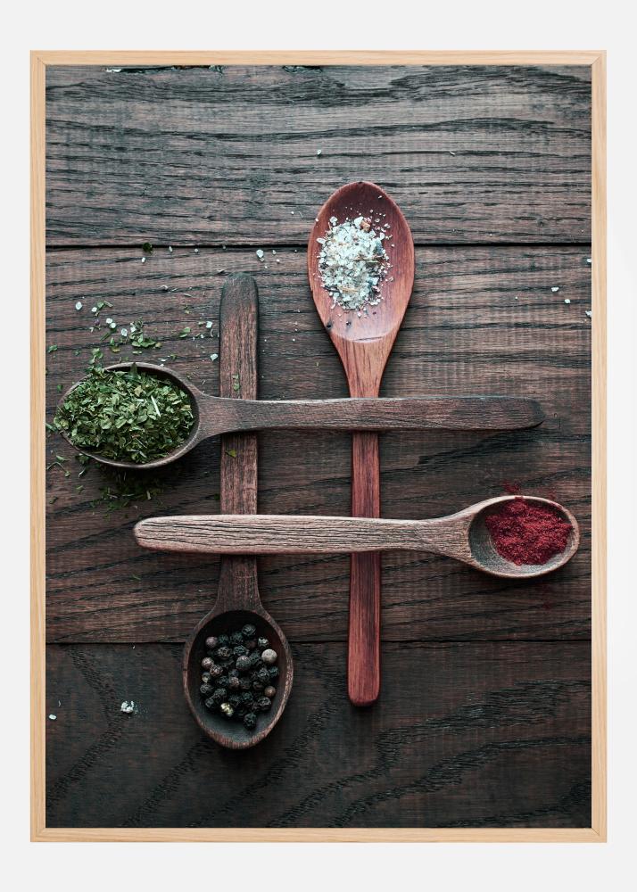 A still life poster of four wooden spoons each holding a different spice. The four spoons criss-cross each other forming a grid on a rustic wooden table. Herbs and spices spill out from each bowl creating a fun cooking ambience, perfect for your kitchen inspiration.