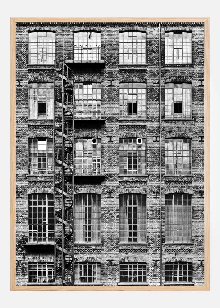 An urban poster featuring the facade of an old building complete with a twisting spiral staircase. The dramatic square windows contrast with the curves of the stairs. This print is great for geometrical shapes