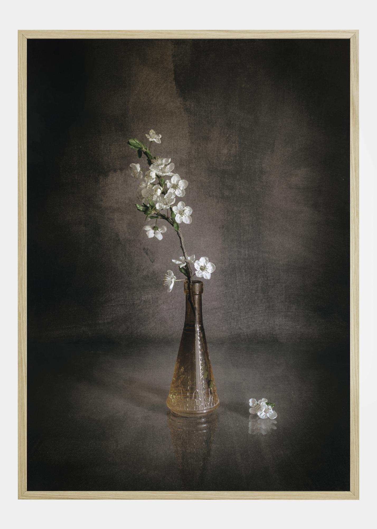 A spring poster of white flowers in a thin brown vase. The vase casts shadows in two directions creating a bright focal point where the star-shaped flowers spring up against the dark brown broad-brush strokes of the wall behind. Contemplate this elegant springtime still life.