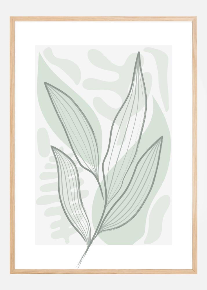An abstract poster of leaves on a simple green background of different leafy shapes and designs. Using soft greens and greys, the simple leaf design, outlined in a strong grey line, gives off powerful spring vibes for a soft feel that can be added to any room in the house.