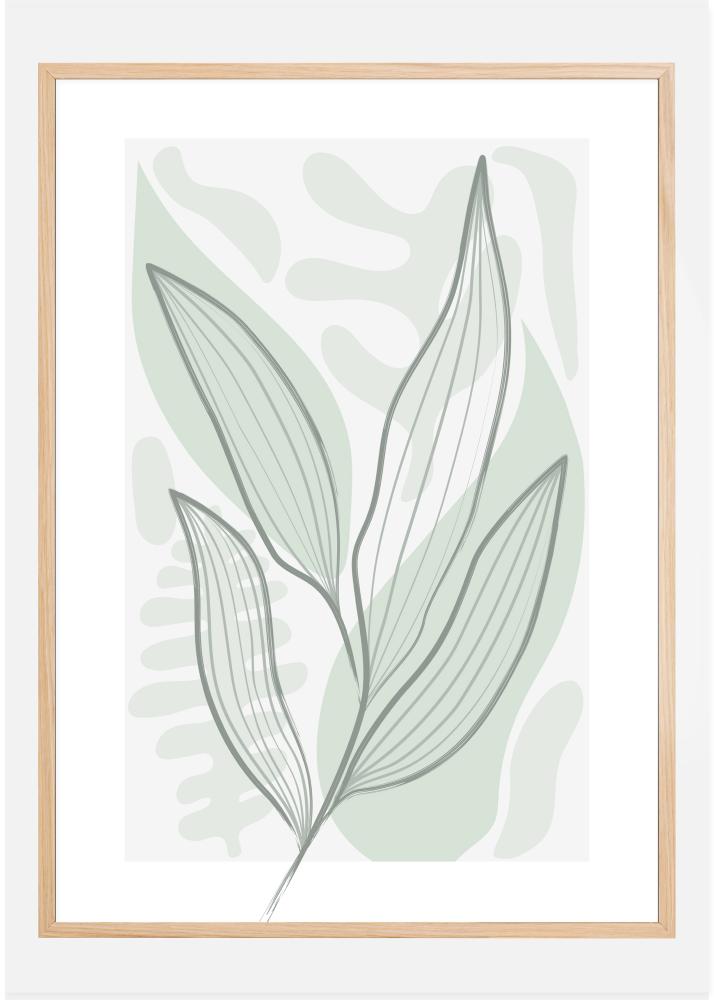 An abstract poster of leaves on a simple green background of different leafy shapes and designs. Using soft greens and greys, the simple leaf design, outlined in a strong grey line, gives off powerful spring vibes for a soft feel that can be added to any room in the house.