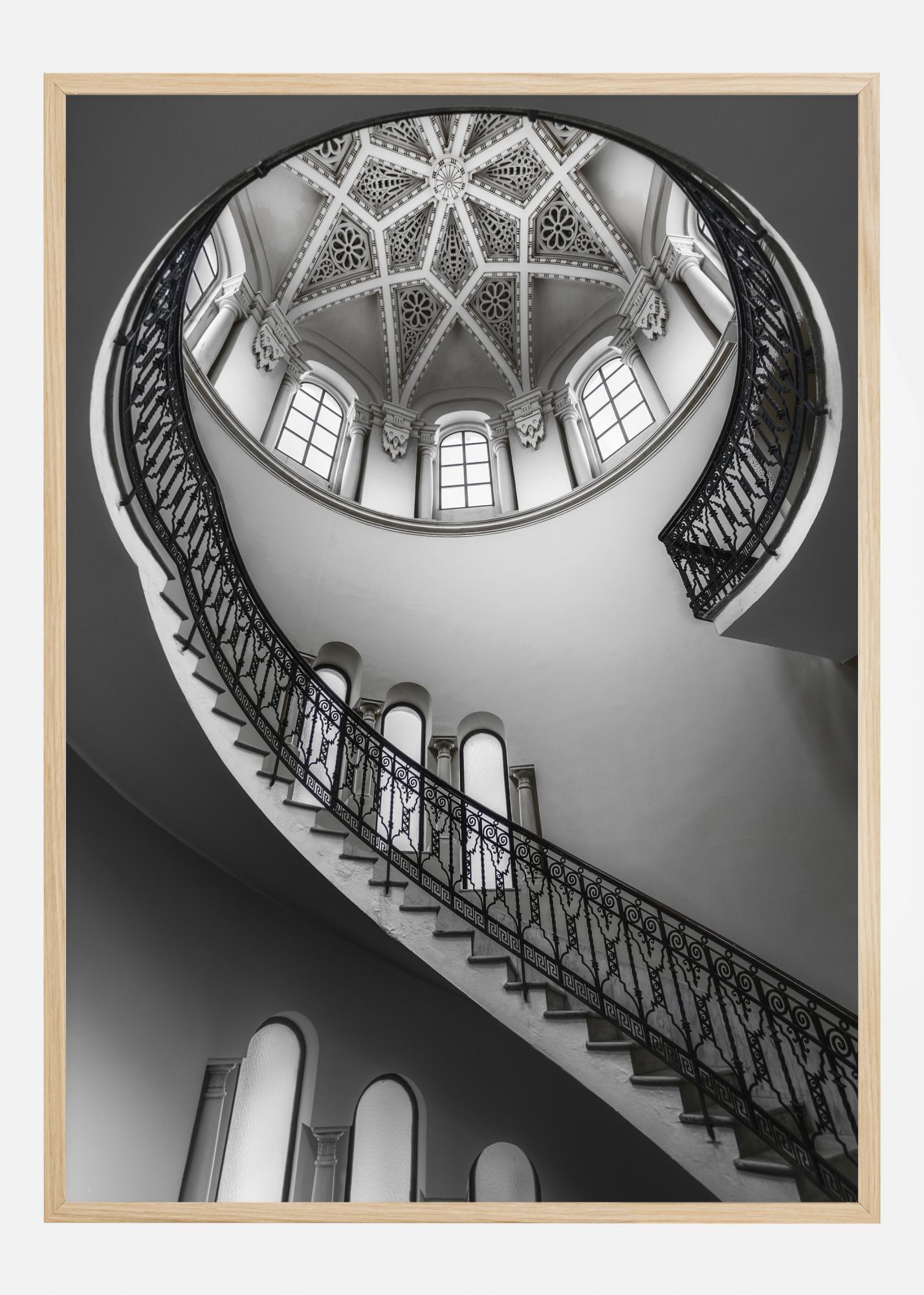 An intricate poster of the interior of a building. A spiral staircase with intricate wrought iron bannisters winds its way up towards the ceiling. Your eye is drawn up to the dome with a stunning latticework design and bright windows where the light shines in. Elegance and detail combine in this black and white image.