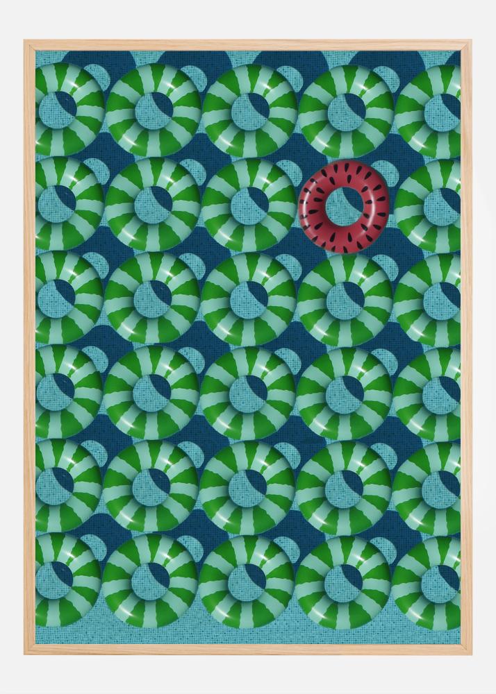 This playful and colorful poster is a tribute to individuality and originality. In a sea of identical green and white float rings, a single watermelon float catches the eye and offers an instant sense of joy and fun. This print is a perfect summer companion that highlights the uniqueness of standing out from the crowd.