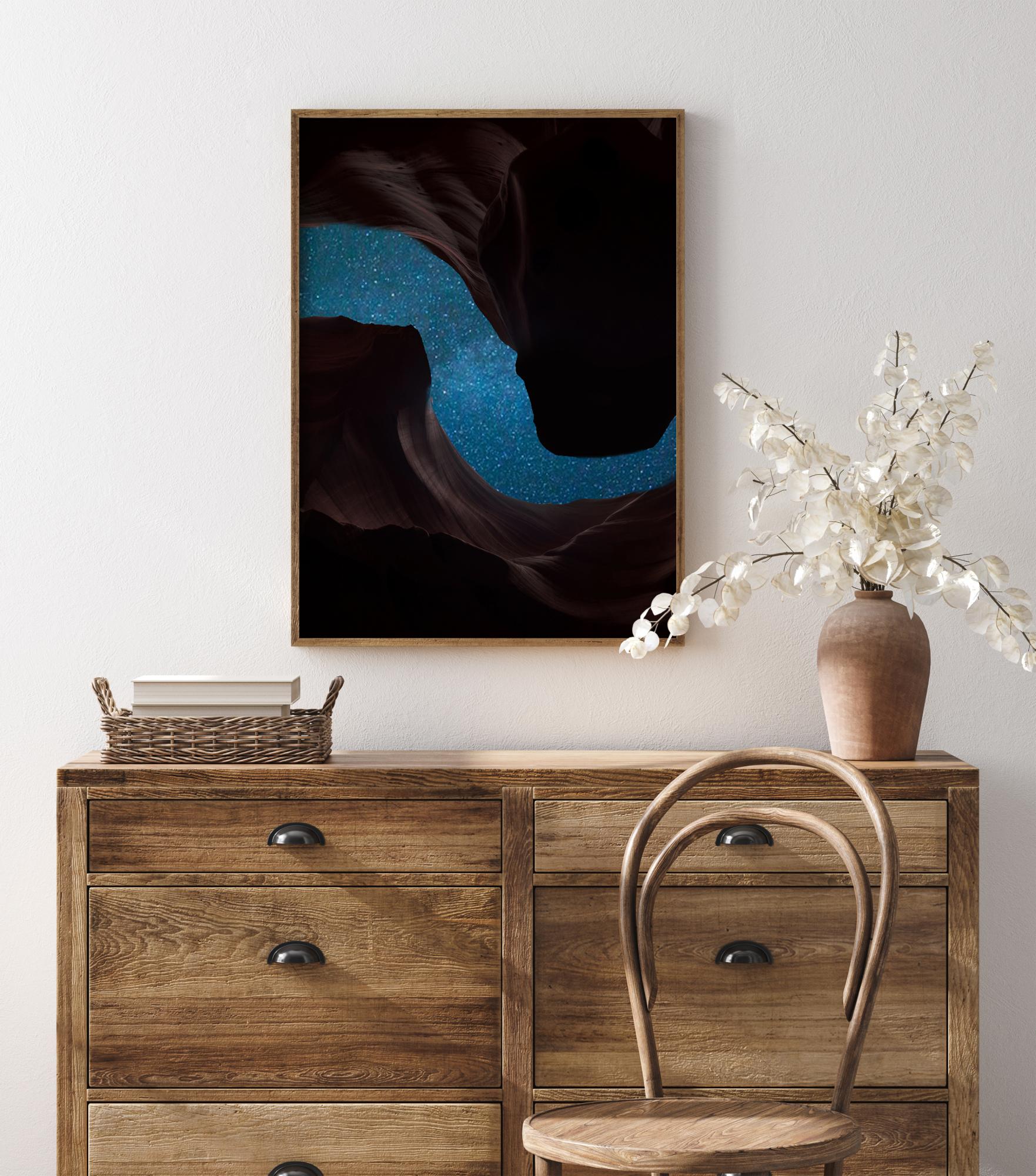 A magnificent night-time poster of the starry sky peeking out between some dramatic rock formations. The deep red rocks swirl around the top and bottom of this photo creating a starry path for the night sky to shine through in this vivid image designed to elicit awe.