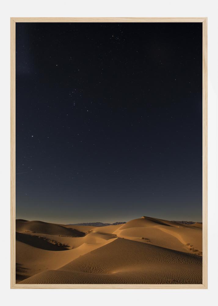 An evocative poster of the desert at night. Soft golden yellow dunes spread out into the distance at the bottom of this image. Above the sand stretches an enormous expanse of dark blue sky with soft stars studded about. Create a feeling of vast space when you bring this home.