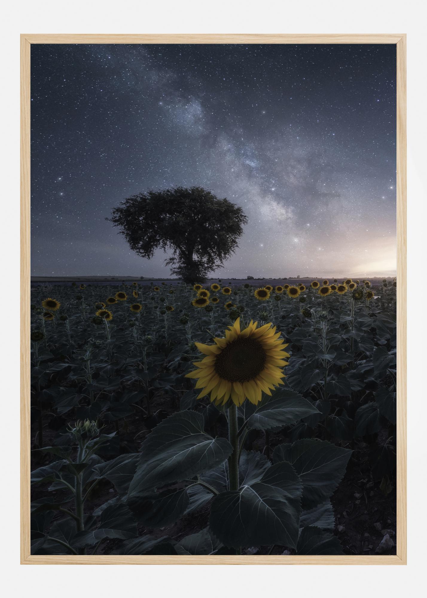 A floral poster of sunflowers at night. The sunflower field holds the bright yellow blooms against the night sky. This is mirrored by the sunset in the distance that still illuminates the flowers, but also brightens the sky so the stars can be seen. Mysticism abounds in this starflowers view.