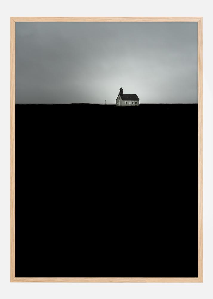 This poster provides a strong and atmospheric image of Strandarkirkja, a solitary church standing against a dramatic sky. The dark silhouette of the landscape creates a sharp contrast against the gray sky, giving a sense of isolation and stillness. The church's white walls illuminate the landscape, offering a symbol of hope and guidance in the surrounding gloom.