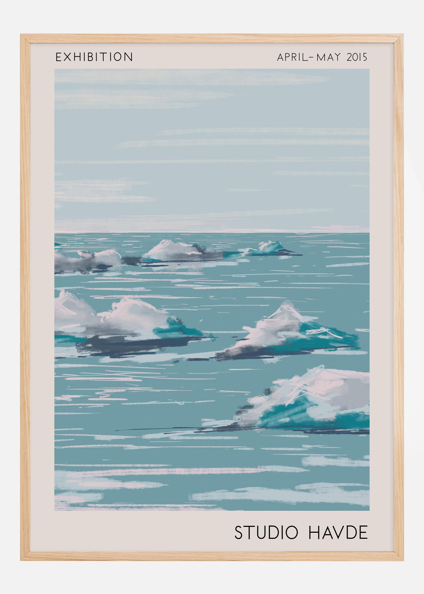 This peaceful and atmospheric poster from Studio Havde's exhibition in April-May 2015 conveys a strong sense of the shifting and powerful nature of the sea. The artwork depicts a series of icebergs breaking through the calm surface of the sea, painted in a relaxing palette of cool blues and soft white tones that create a sense of cold and stillness in the composition. This scene of the arctic landscape is both timeless and current, reflecting nature's relentless power and beauty.