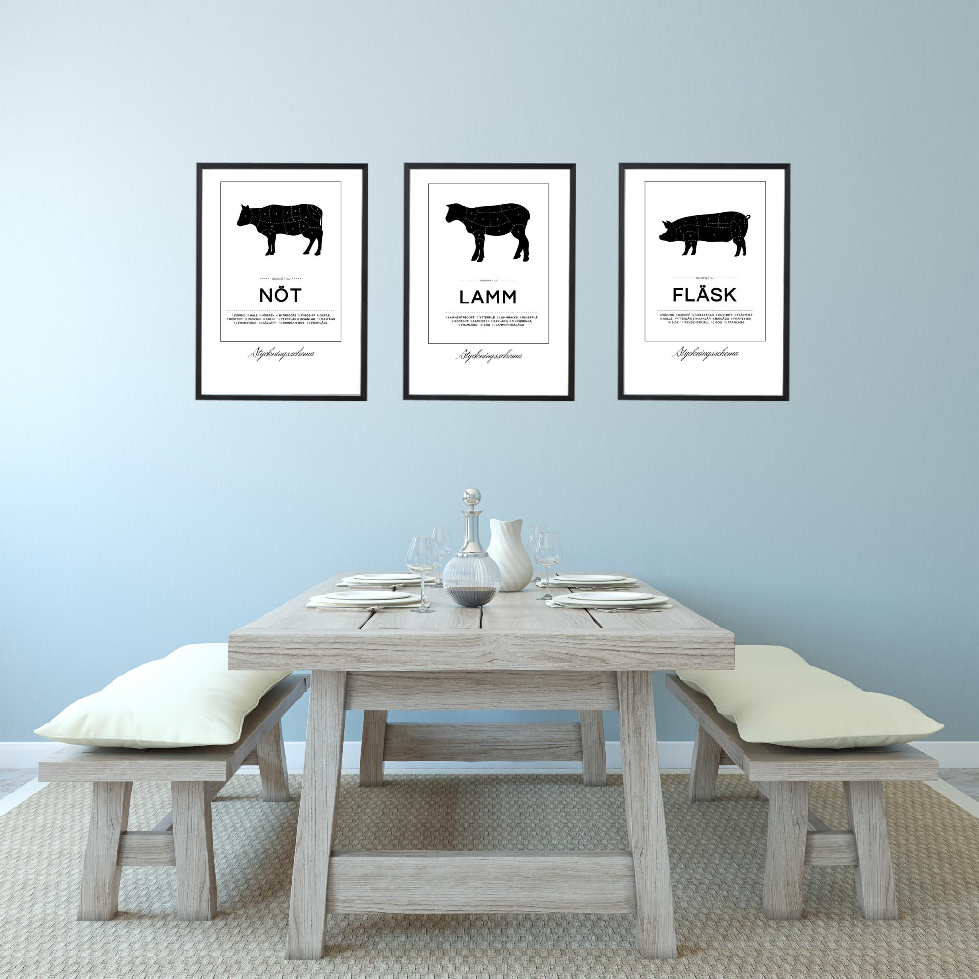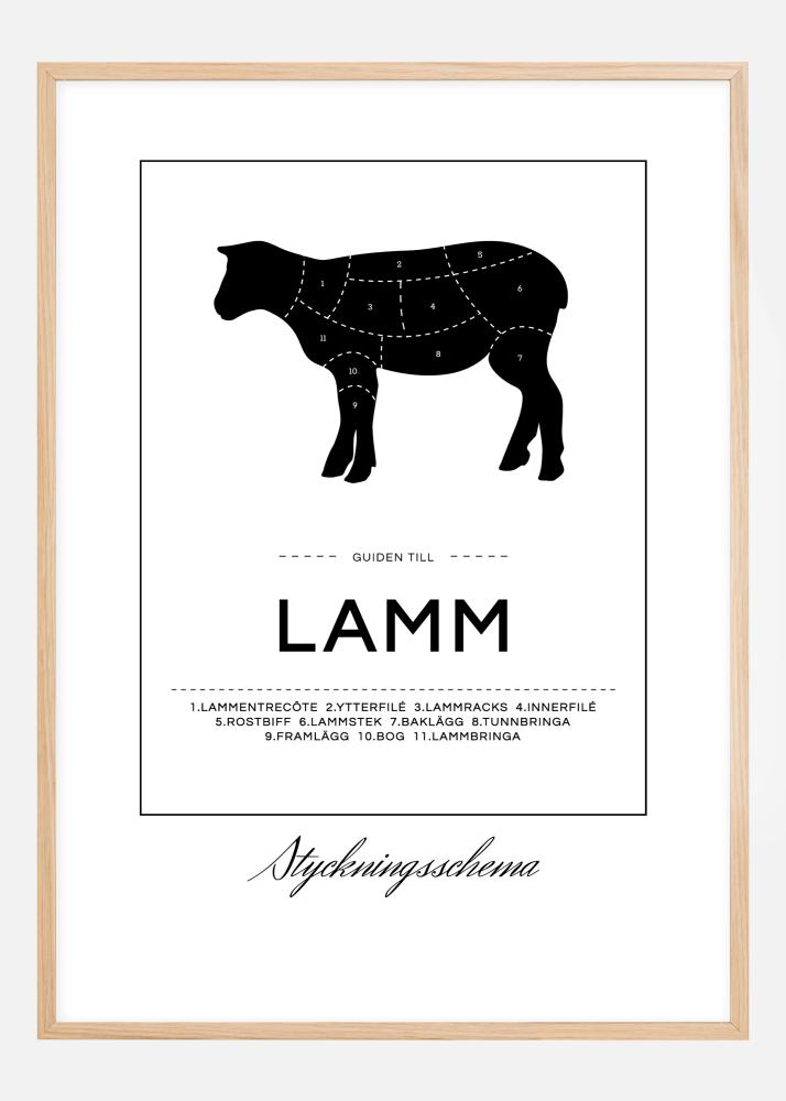 Learn where to find all the delicacies from lamb with this stylish poster on the wall. The poster depicts a black lamb divided into markings showing where, for example, outer fillet, lamb racks, and shoulder are taken from. As a complement to the image, the text "The Guide to Lamb" along with a neat numbered list of the different parts is presented. A thin rectangle runs around the text and image, and below the rectangle, there is a print with the text "Butchery Scheme".