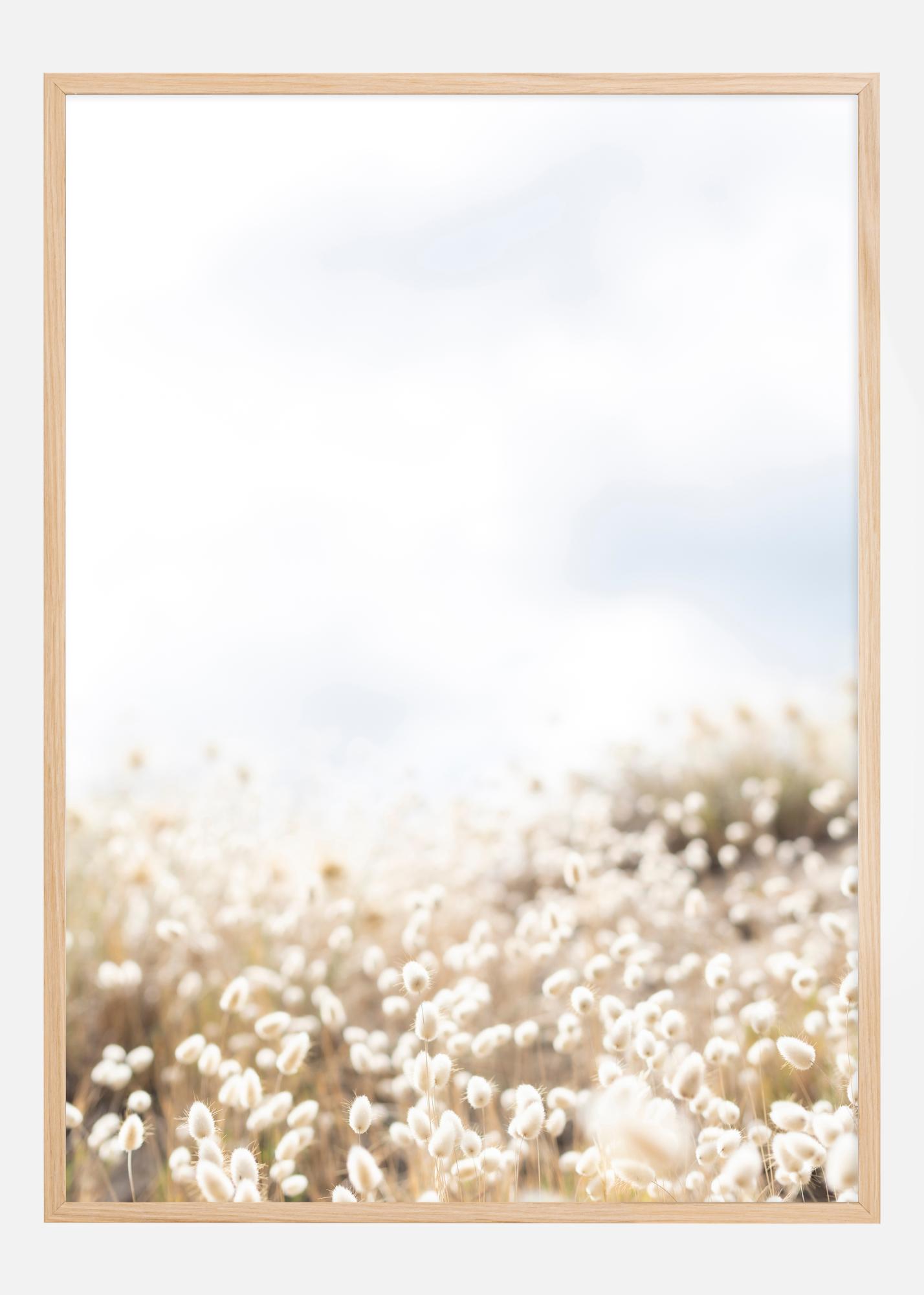 This dreamy poster captures a field full of light, fluffy flowers basking in soft sunlight. The motif, filled with nature and tranquility, conveys a sense of warmth and calm. The careful heads of the white flowers nod in the still breeze, and the image is draped in pastel tones of yellow, beige, and white that blend with the clear blue sky.