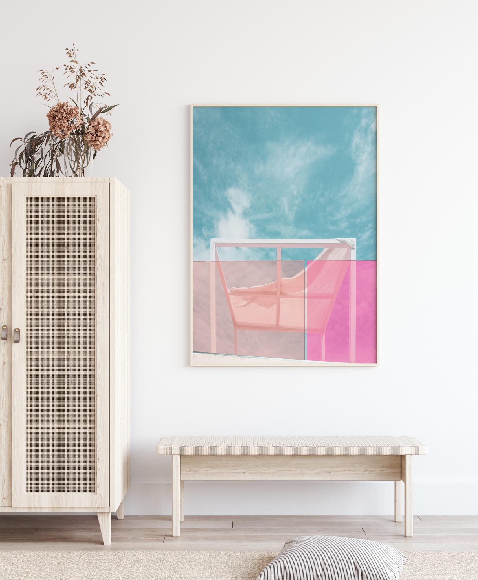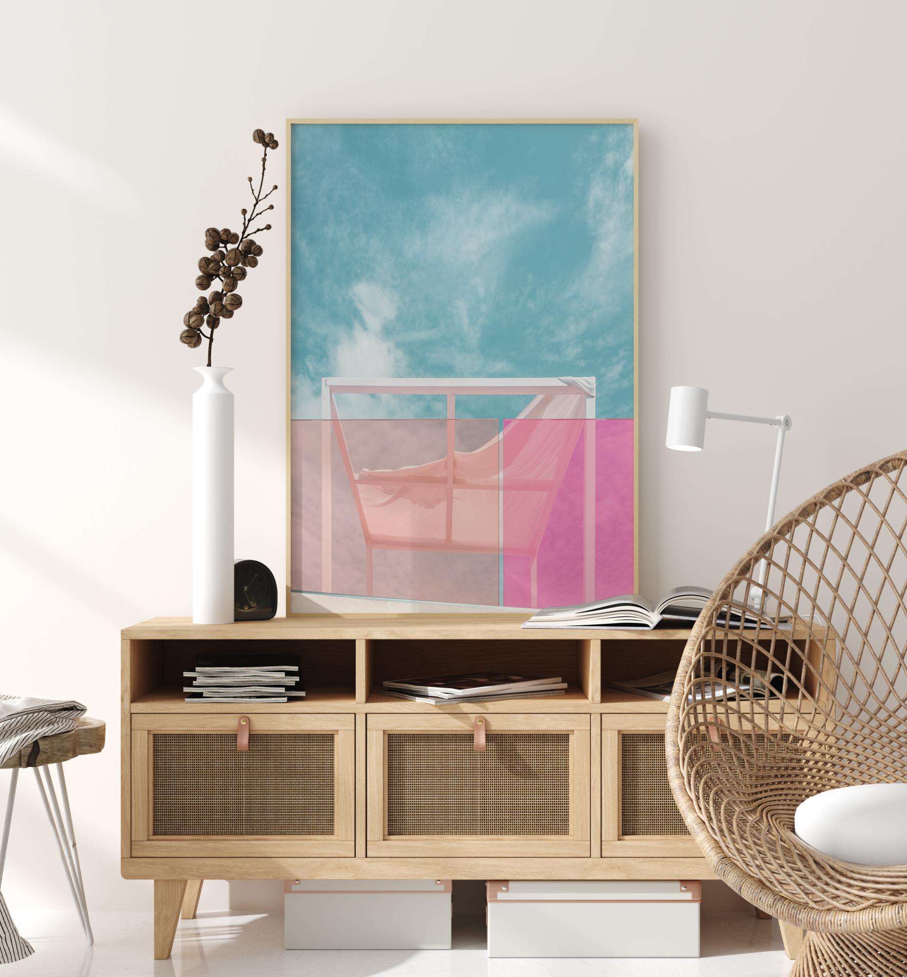 A colourful poster of the summer sky and a sunroof. Through the pink glass panes of the balcony you can see the white canopy and the soft white clouds in the blue sky. Imagine sunbathing out here on the roof on a warm summer day.