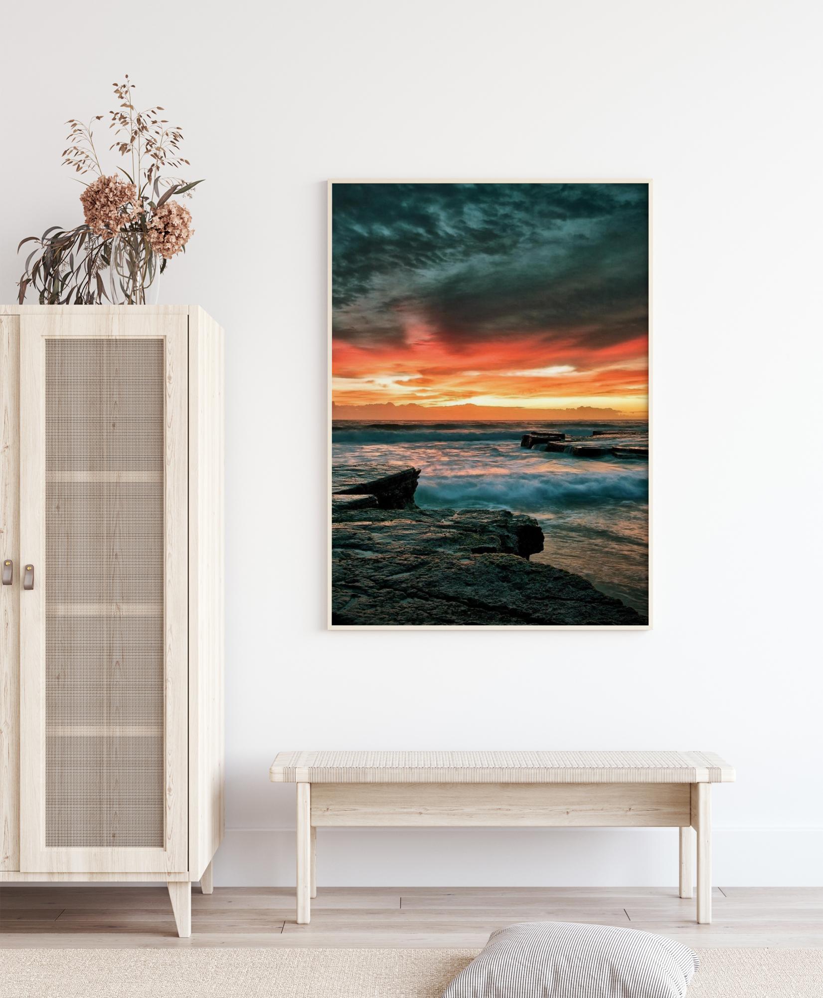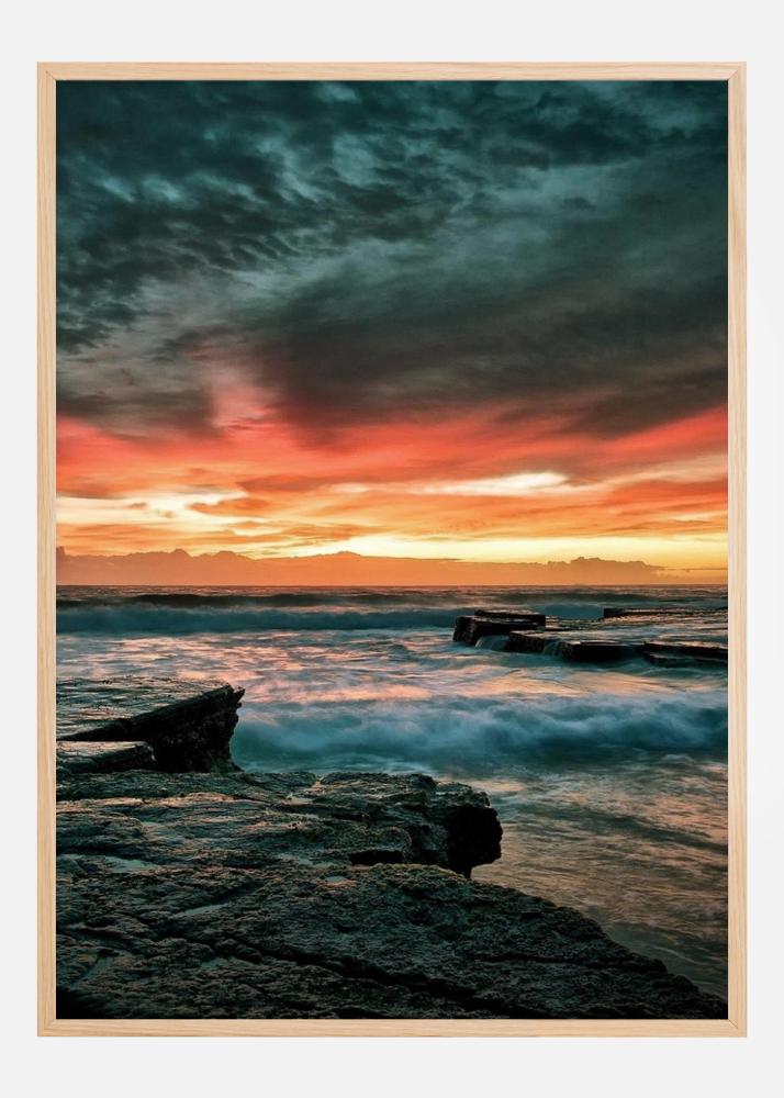 An epic poster of a sunset over water. Waves from the sea crash against the flat rocky shore. Dark clouds are directly overhead with a bright red sunset low on the horizon creating a dramatic and impressive image that will hold your focus.