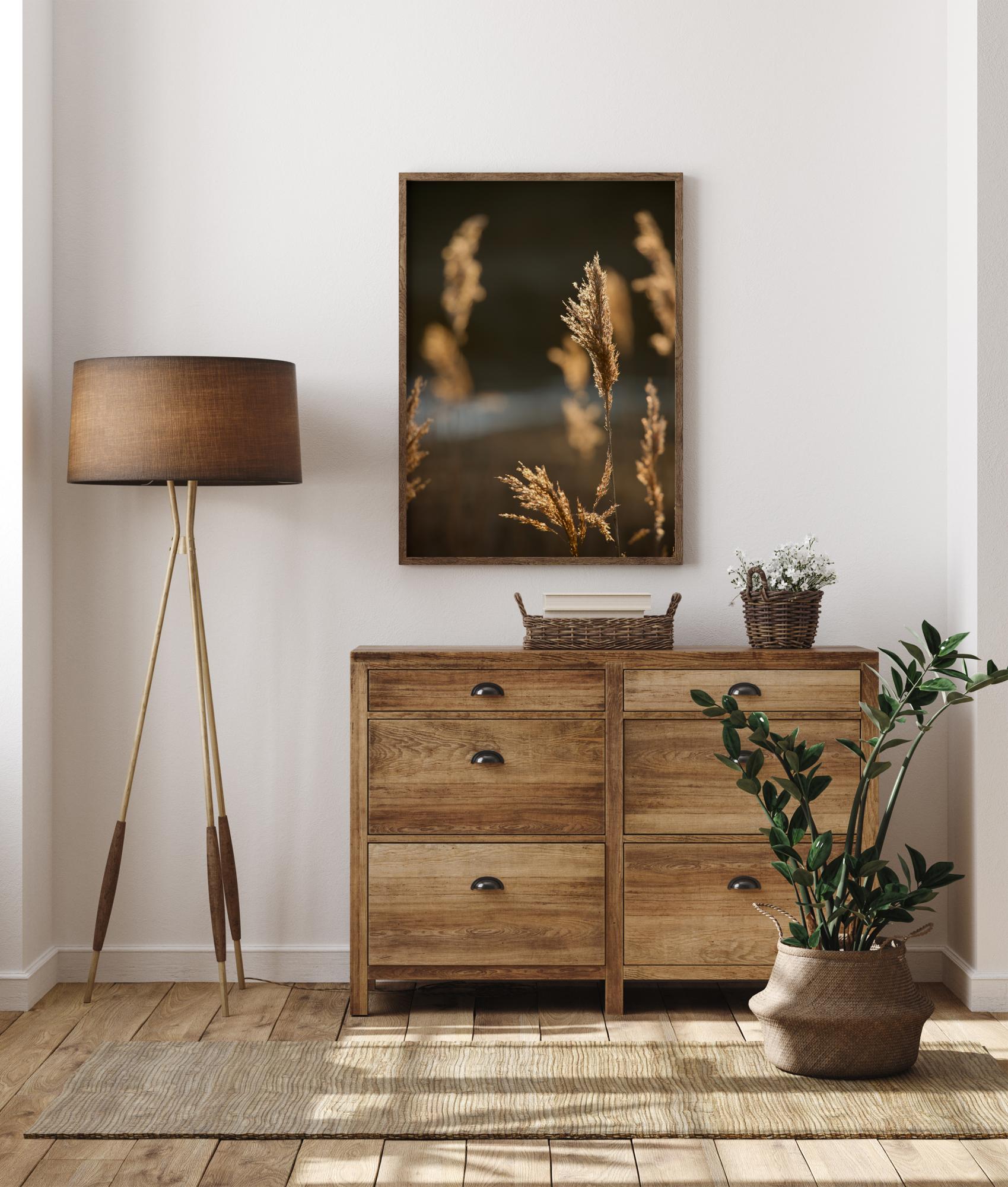 A summery poster of sunshine on a field. Close-up ears of grass sway in a summer breeze. They catch the golden light of the sun, which also glints off the distant river. Enjoy this ambient and soft image bringing summer home when you hang this up.