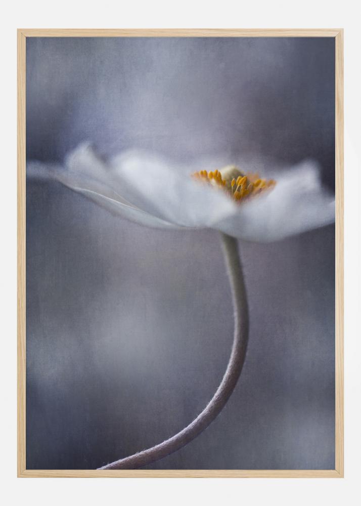 A floral poster of a close-up of a white flower against a soft grey background. The orange centre of the flower stands out against the subdued background creating a bright focal point and highlighting the beauty within a flower as well as the outside. Ethereal and magical it exudes peace.