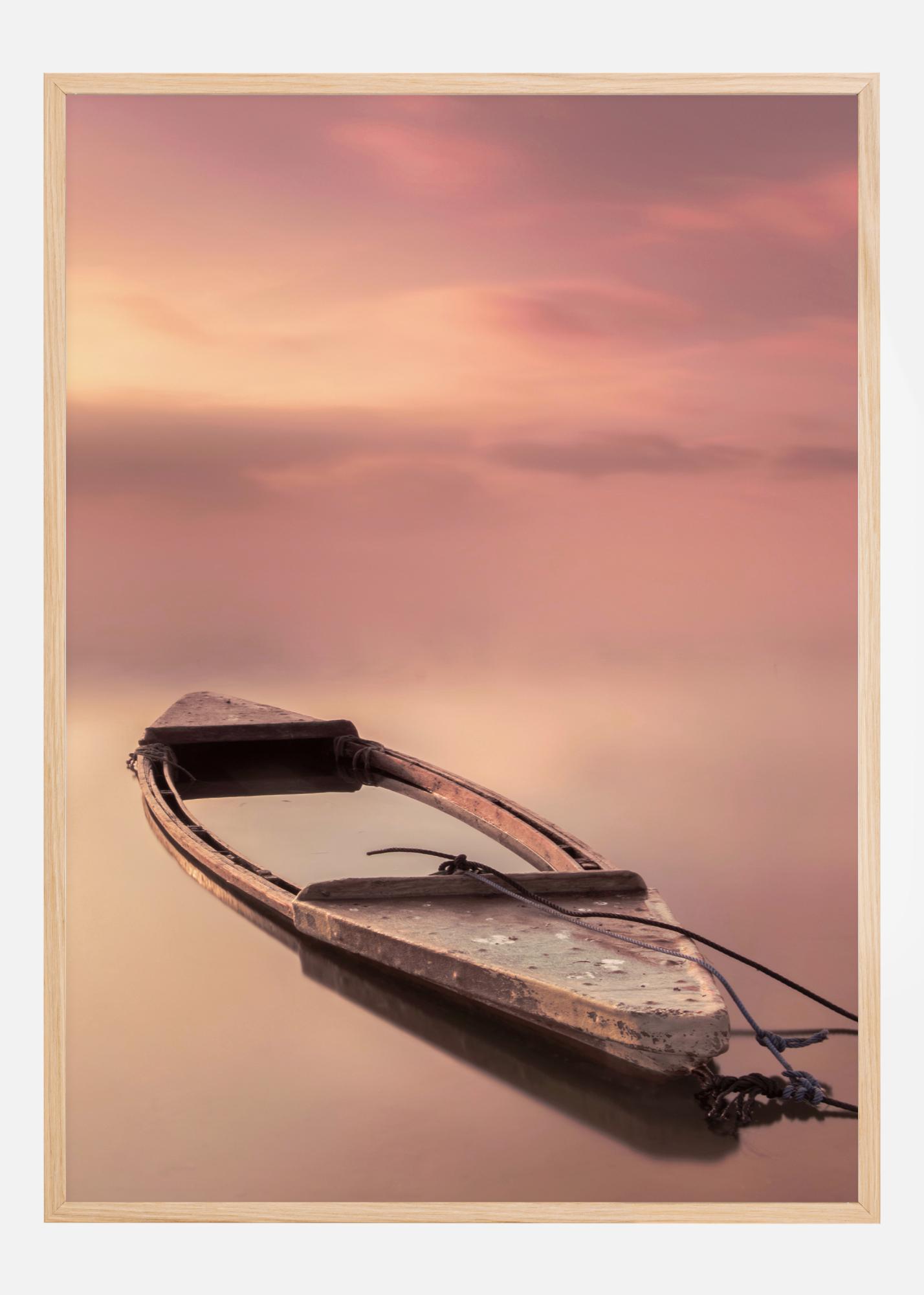 A tranquil poster of a wooden boat sitting on still water. The water and sky are soft pink and purple pastel colours. They blend into each other making the water and sky merge going on forever. The boat is the only solid thing as a focal point in this soft calming image.