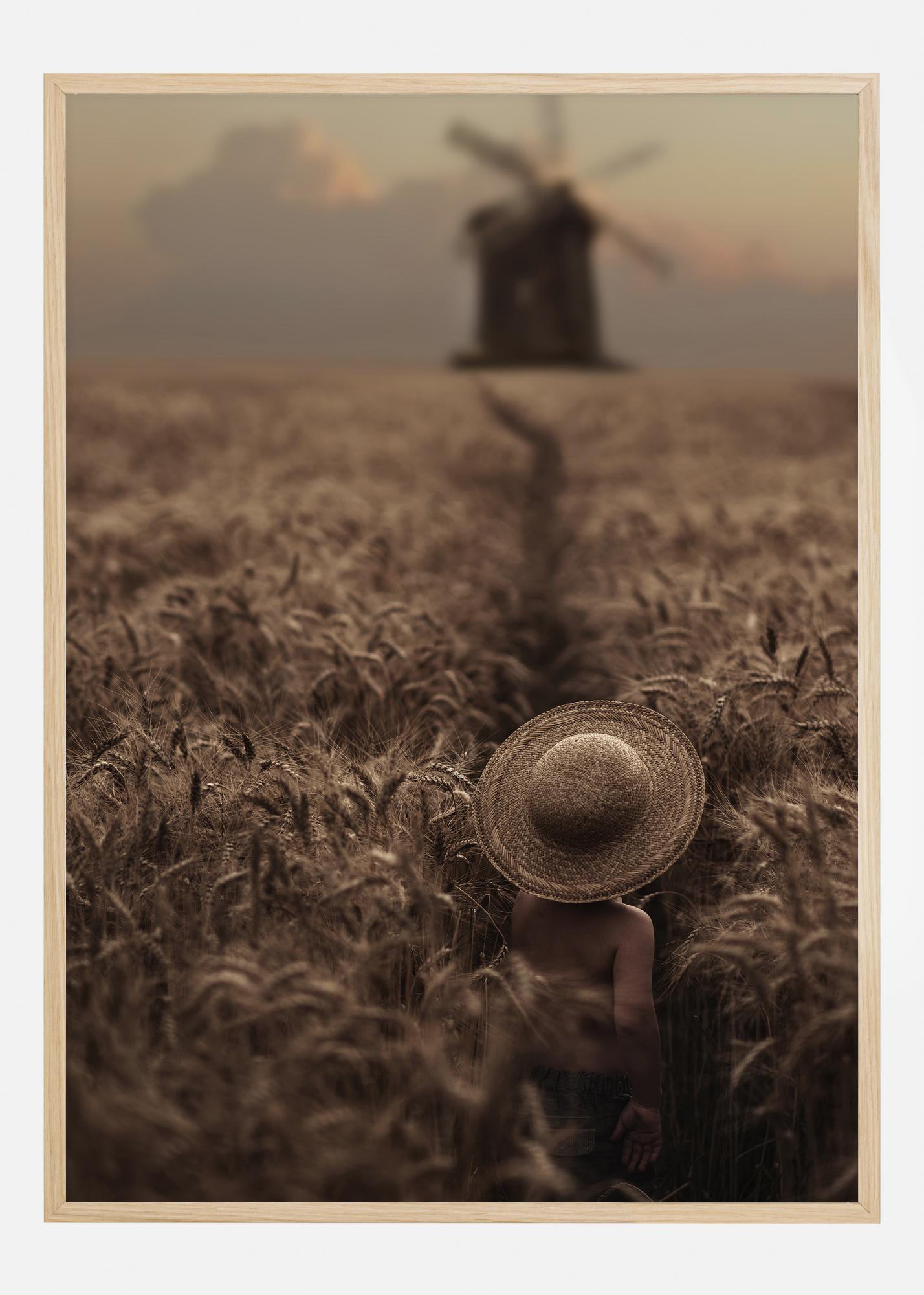 A portrait poster of a boy in a wheat field with a windmill off in the distance. The soft yellows and pinks create a truly tranquil pose. Venture toward that windmill with the boy in this image.