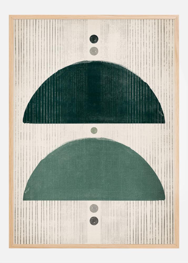 This poster is more than just a decorative image; it is a contemporary artistic interpretation that unites the natural with the stylized. The three circular shapes, centered between the semicircular blocks, serve as a focal point that brings the whole composition together. This print could serve as an elegant wall feature in a minimalist home or office, and the soothing green tones would bring a sense of nature and calm to any environment.