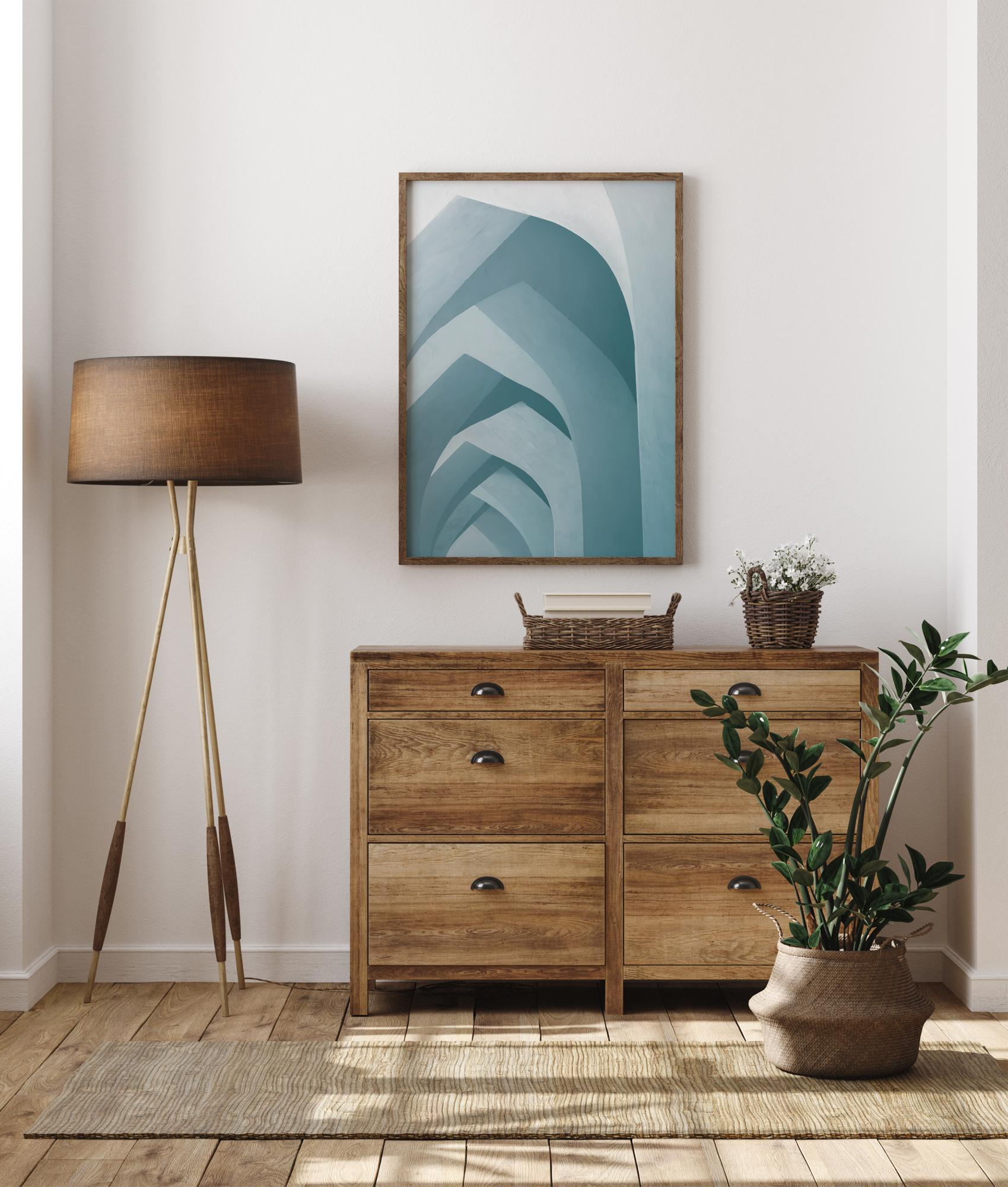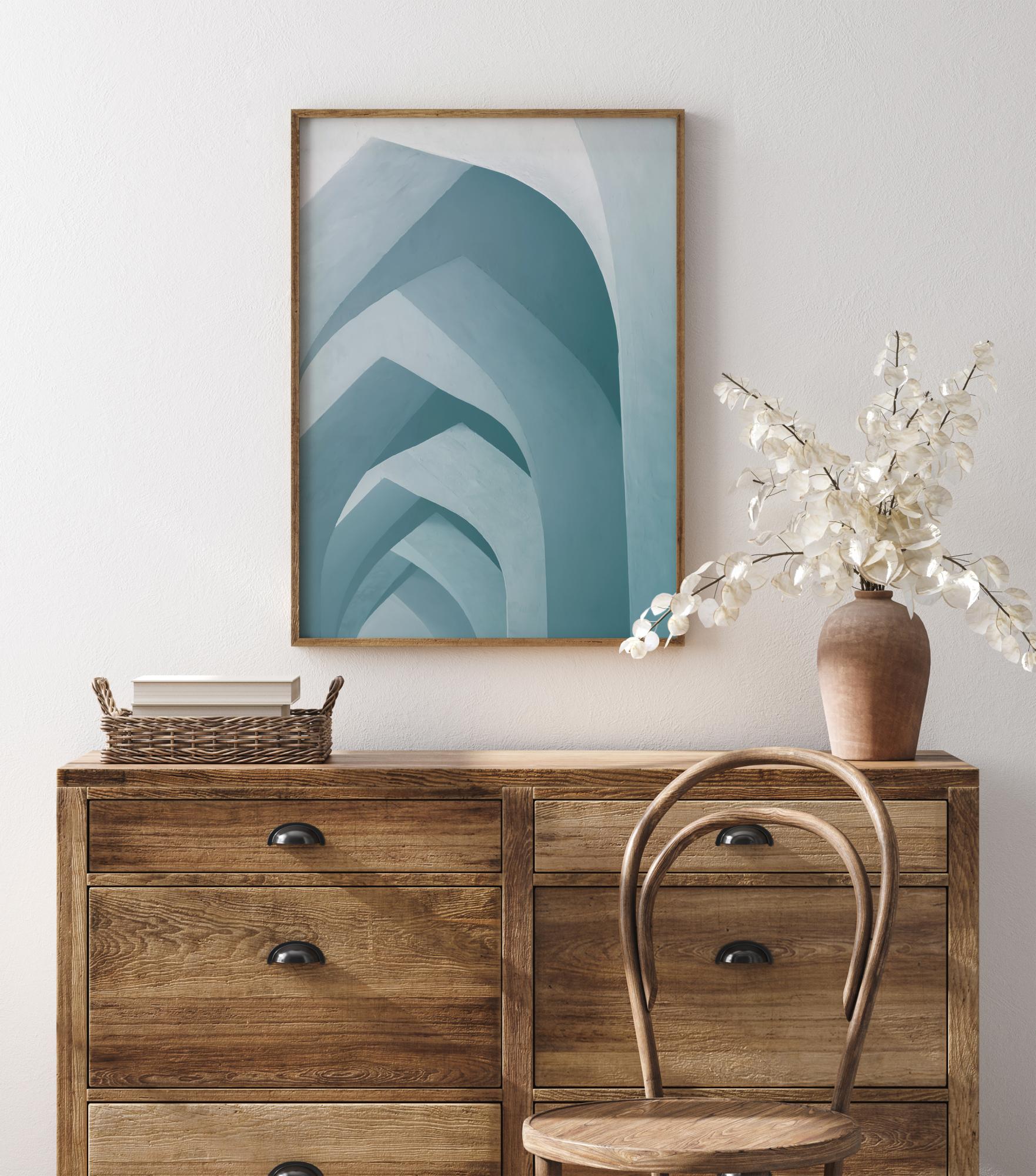 A graphical poster of different shapes creating archways. Each archway shape is created through the use of block colours in various different blue tones. Dark and light juxtapose to make the illusion of depth and the feeling of a long hallway. Add this to a white wall to make those colours even more contrasting.