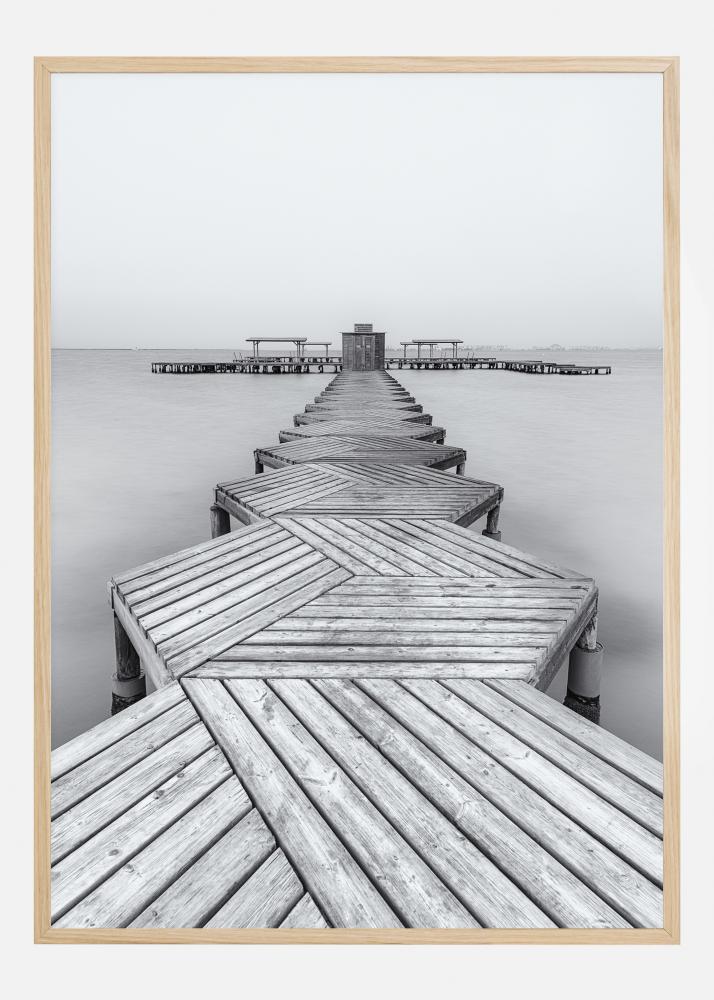 A fun poster of a hexagonal pier making its way off into the distance across a still lake. The image is in muted greys making this look cool rather than warm. The wooden pier leads you off into the distance where docking awaits. Pair with a bright colour to add warmth.