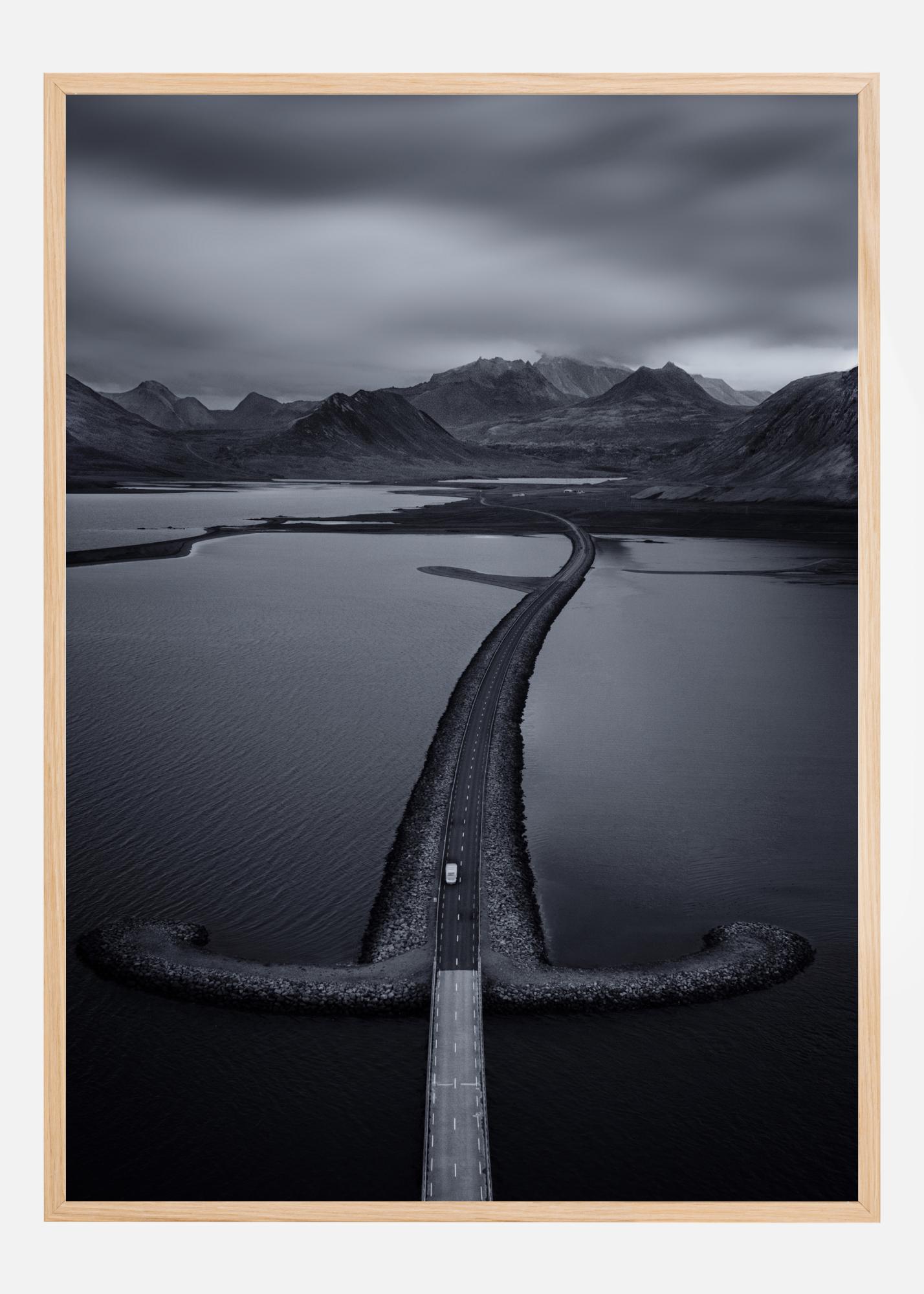 A grey tone poster of a wide road moving through lakes and into the mountains beyond. A grey cloudy sky hangs overhead. A single white car travels the road into the distance. Pair with a bright wall to add some colour to this austere image.