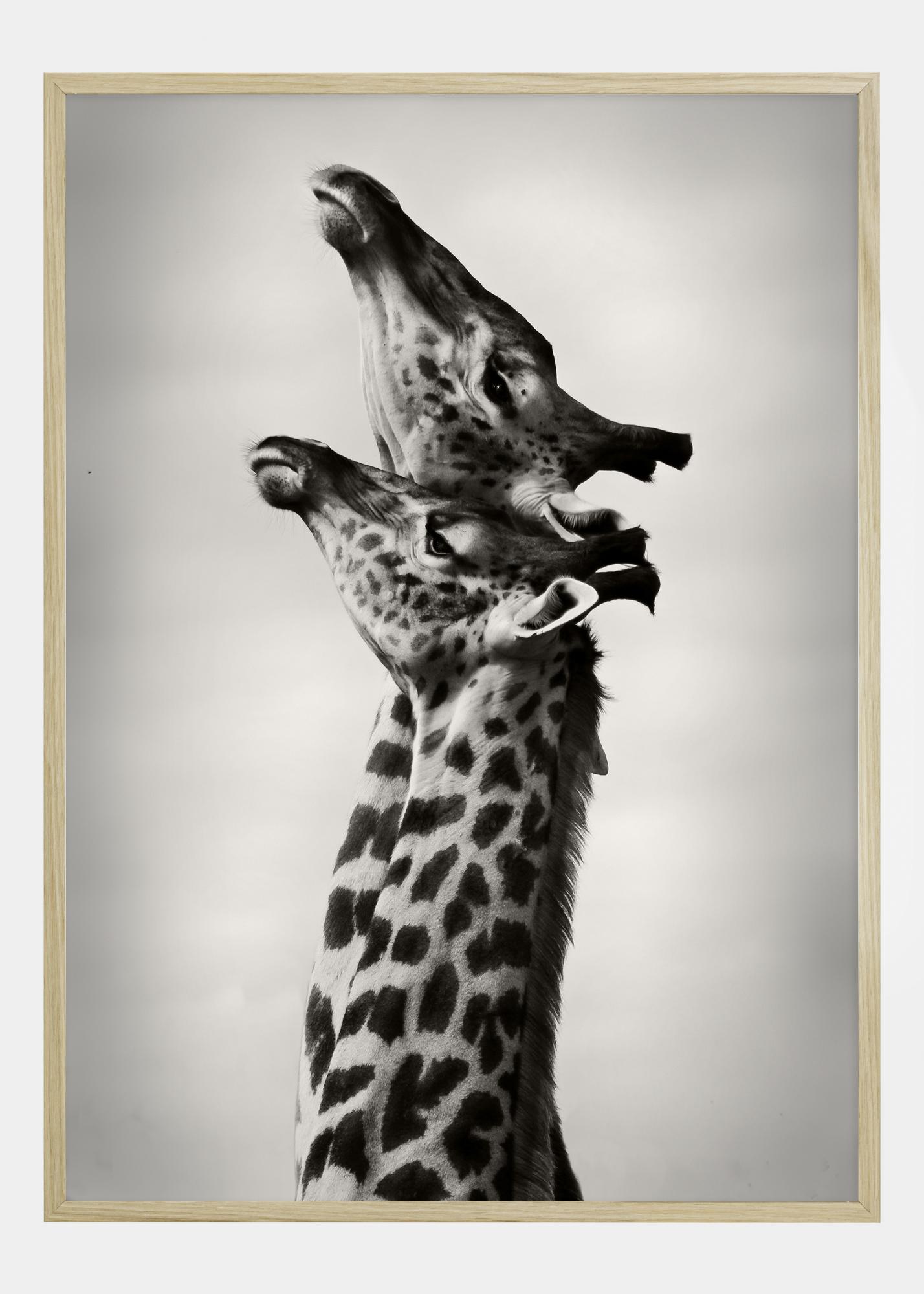 The poster shows a delightful moment between two giraffes appearing to share a tender interaction, their necks elegantly curved towards each other. The image is captured in black and white, which enhances the iconic patterns on the giraffes' skin and creates a strong visual contrast against the soft sky background.