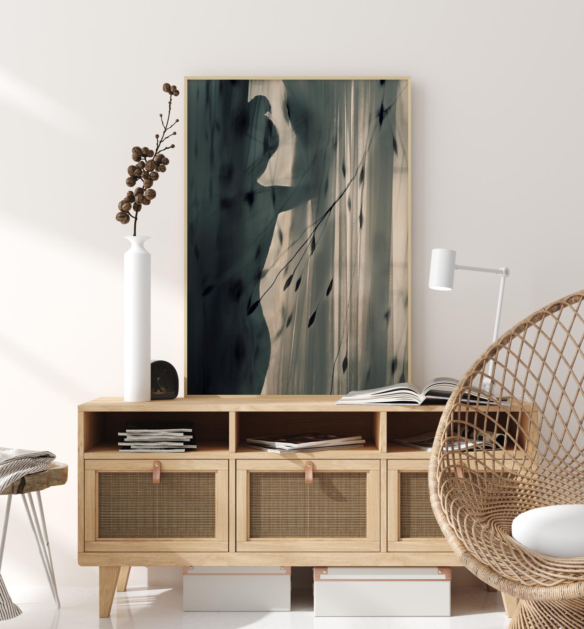 A portrait poster of the figure of a person as they look through a curtain to the outside world. The soft translucent fabric blows across the image as the silhouette of the person leans against the window frame. Soft light from outside illuminates the scene just enough to see what's going on.
