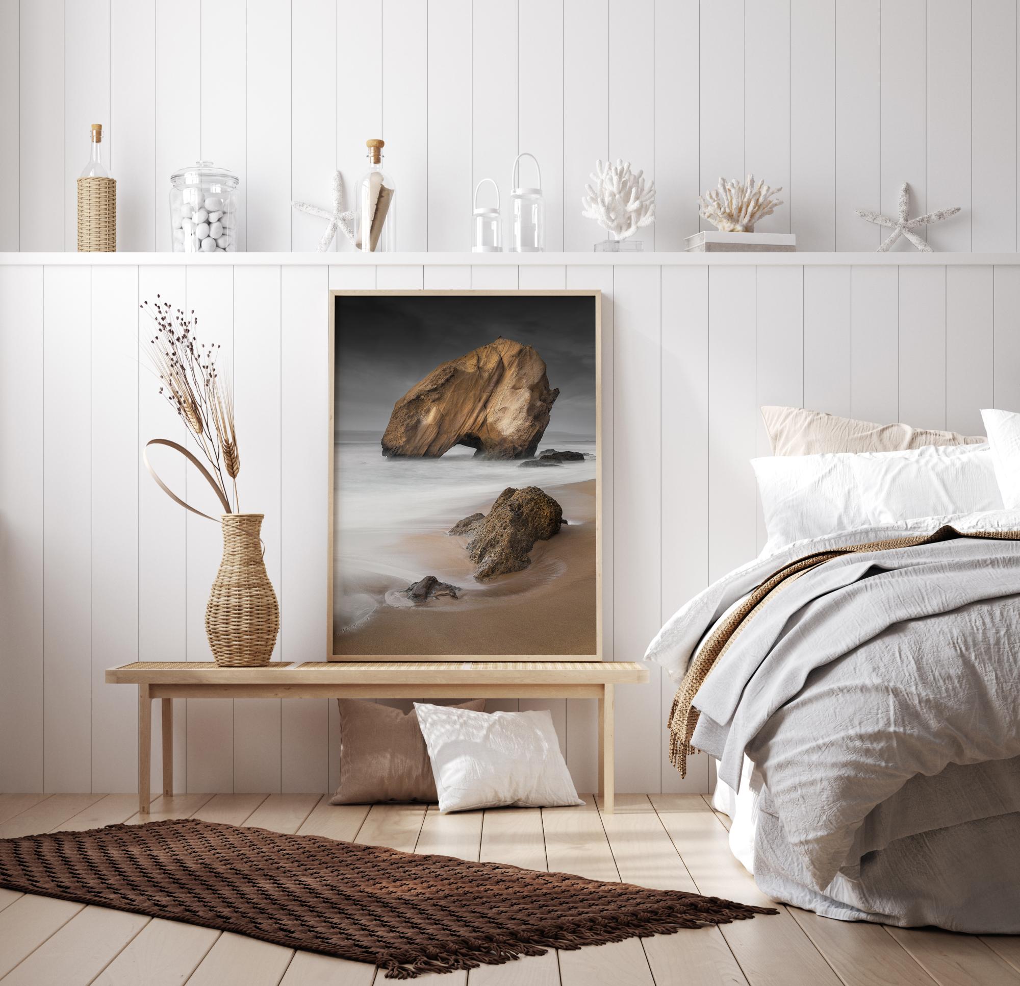 A dramatic poster of a beach and rocks under a stormy sky. The white ocean waves swirl towards the shore around a strong sandy rock in the middle of the sea. Soft and unfocused, this softens the potential blow of the incoming storm creating a more serene atmosphere for your home.