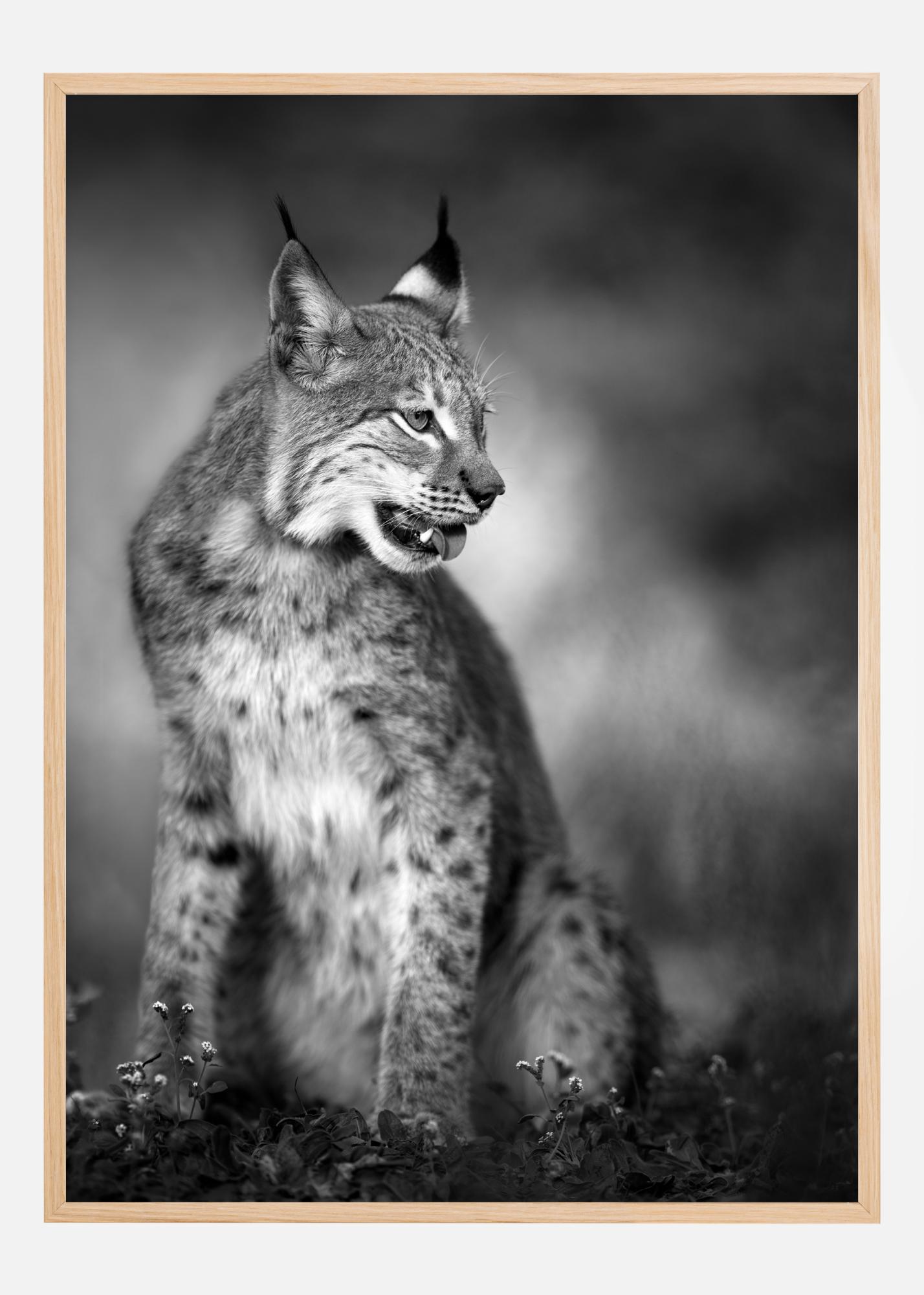 A wildlife poster of a bobcat sitting in the grass. The cat looks off to the right of the image possibly watching some potential prey. The bright spots of its coat and its ear tufts stand out in clear detail. Add this black and white print to a green wall for a natural feeling.