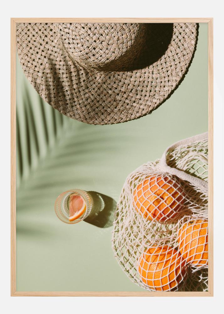 This delightfully summery poster captures the essence of holiday mood with its relaxed and fresh imagery. A braided sun hat and a net bag filled with sun-ripened oranges against a background of soothing green tones immediately convey the feeling of lazy days in the sun. The image gives an immediate association to warm climates, fresh fruits, and a time for relaxation. It is an excellent choice for anyone wanting to bring a bit of that lovely holiday feeling into their home or workplace.