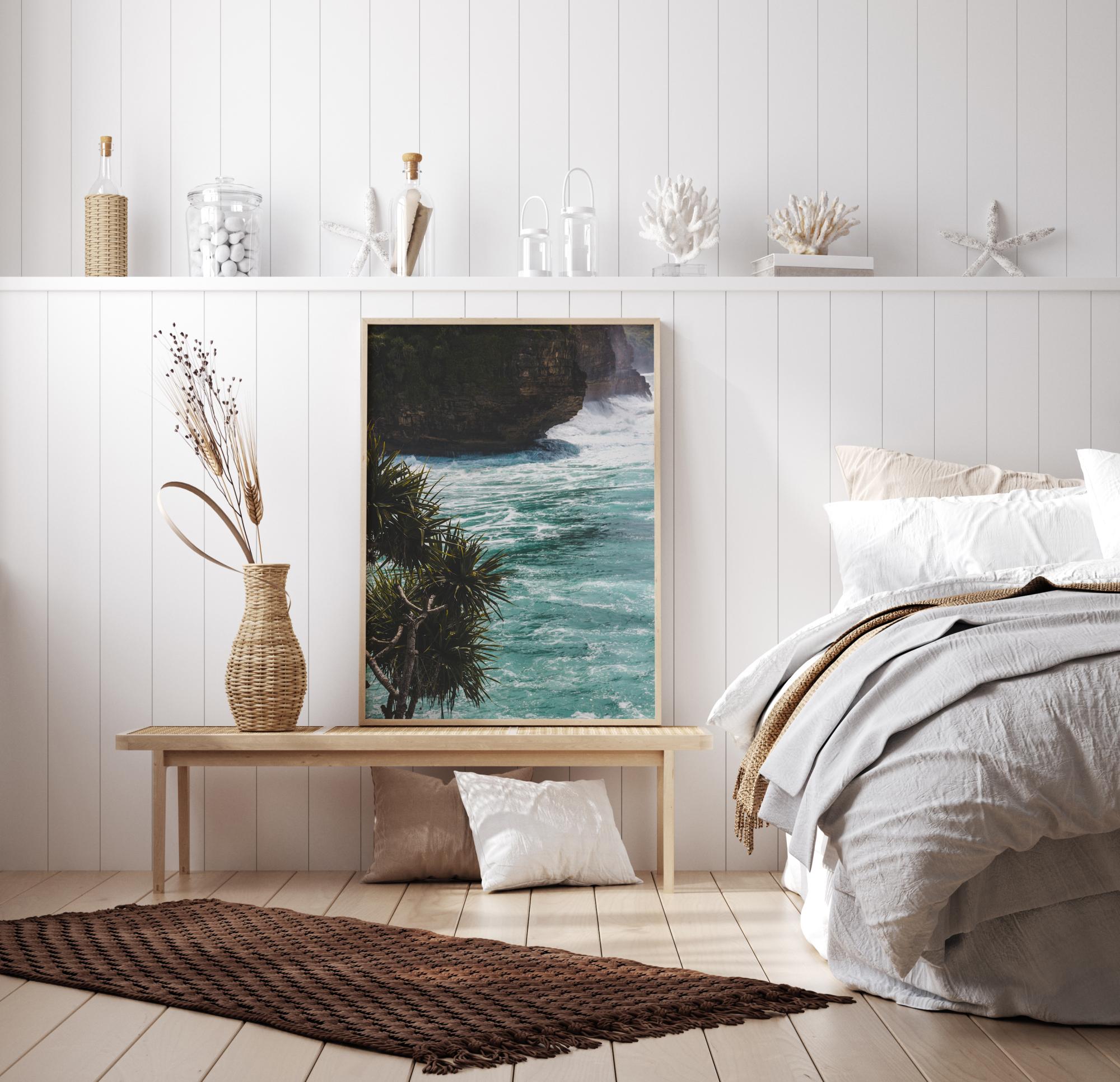 A tropical poster of the sea crashing against the bottom of the cliffs. A group of palm trees blow in the wind to the left of the image to give this a more exotic feel. Feel the warmth of this bright blue scene and imagine your perfect vacation.