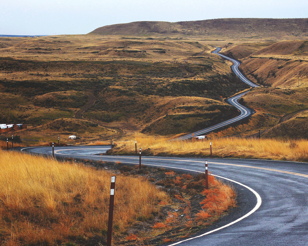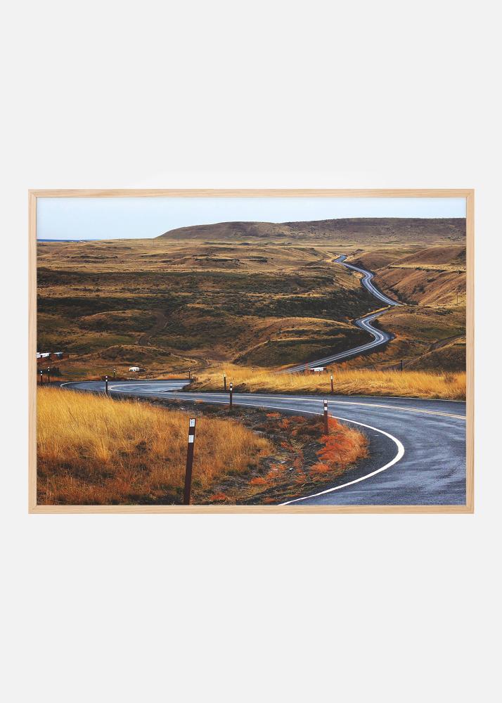 Poster with an asphalt road winding through a sunburnt steppe landscape. The yellow-brown shades of grass against the asphalt's cold surface breaking through the open landscape draw the eye into the picture and along the road. The poster fits well in a minimalist frame where the motif can come into its own and can be combined with other posters for a theme.